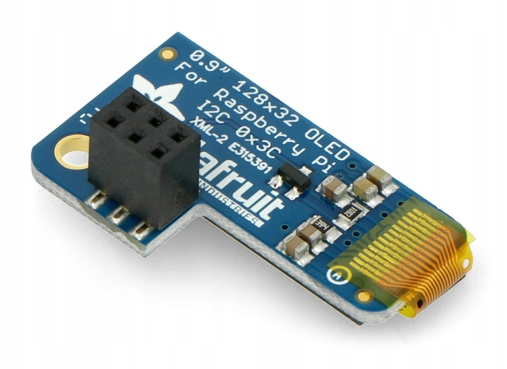 Wyświetlacz OLED niebieski o przekątnej 0,9 " i rozdzielczości 128 x 64 px. Ekran oparty na sterowniku SSD1306, komunikuje się poprzez I2C. Posiada złącze dostosowane do pinów GPIO Raspberry Pi.