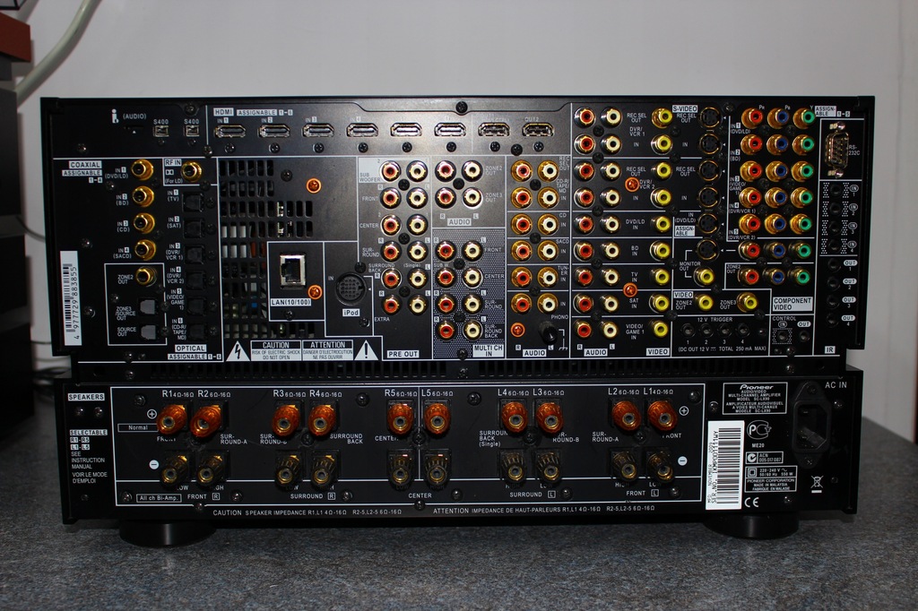 Złącza wejściowe 6 x HDMI (1080p 24/50/60Hz), 2 x iLink, 1 x USB (Type A), 1 x Ethernet, 1 x iPod, 4 x cyfrowe współosiowe, 7 x cyfrowych optycznych, Analogowe wielokanałowe (7.1-kan.), 8 x Composite, 4 x S-Video, 5 x Component