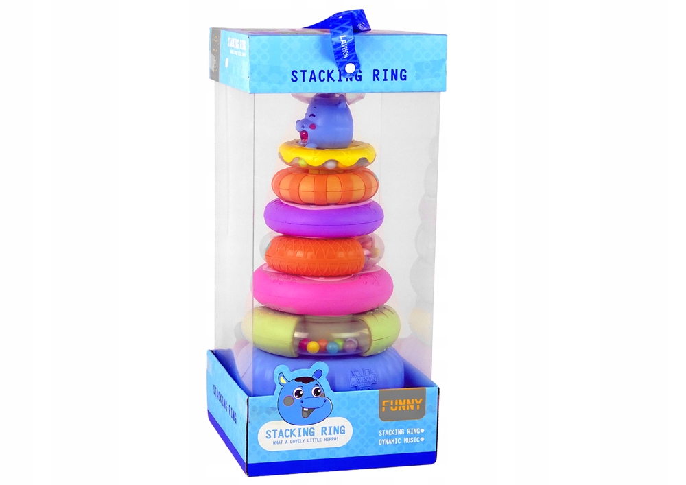 Piramidka składa się z sześciu kolorowych obręczy, które można układać jeden na drugim w różnej kolejności, tworząc w ten sposób piramidkę. Na szczycie piramidki znajduje się uroczy, uśmiechnięty hipopotam. Każda obręcz ma inny rozmiar i inny kolor, co umożliwia dzieciom naukę rozróżniania kolorów, wielkości kształtów oraz ćwiczenie koordynacji. Taka forma zabawy rozwija także umiejętności poznawcze oraz logiczne myślenie, co jest bardzo ważne przy prawidłowy rozwoju Twojego dziecka!