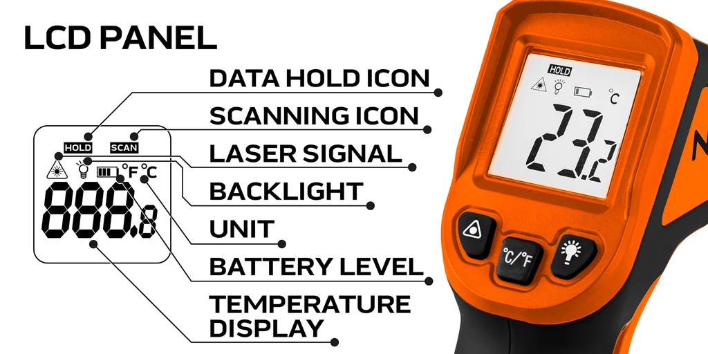 Pirometr, przyrząd do szacowania temperatury (C-50~400, F-58~752) 75-275 marki NEO to urządzenie służące do bezdotykowego pomiaru temperatury powierzchni obiektów z dużą dokładnością, do +/- 1,5% + 1,5 °C w zakresie -50 – 400°C.