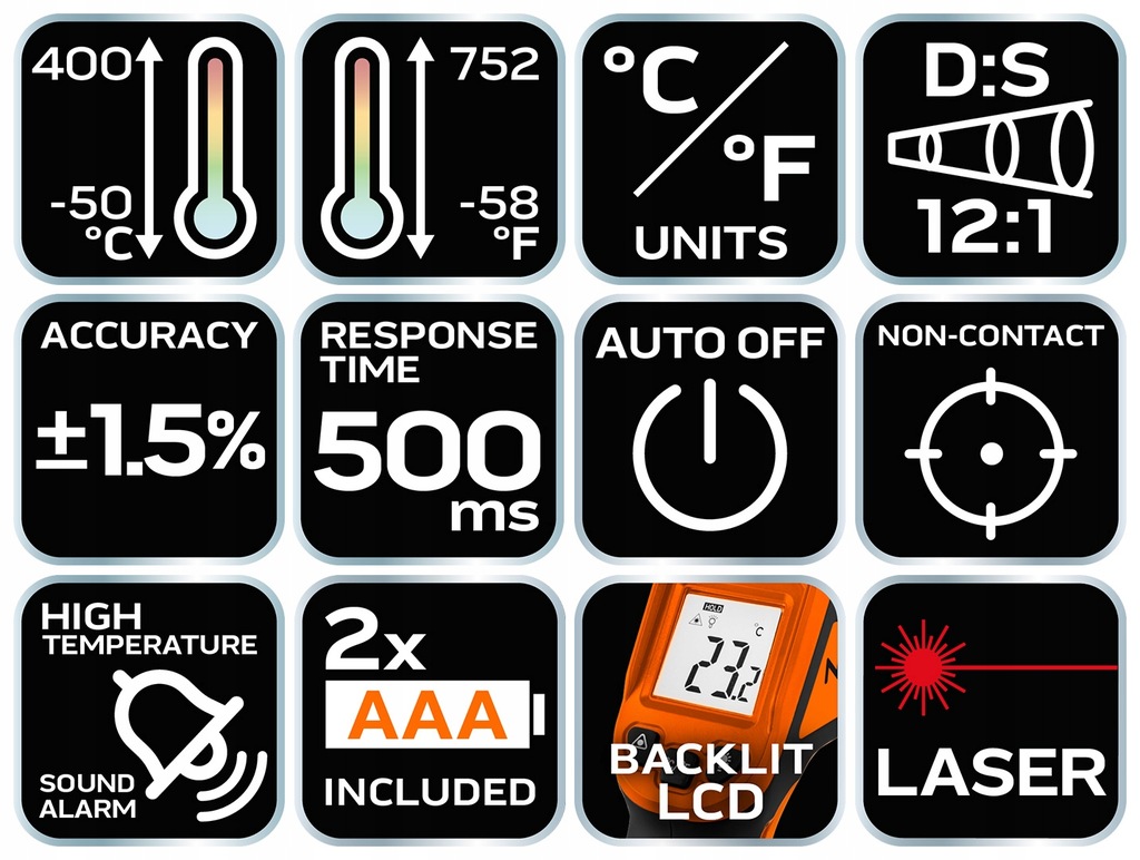 Pirometr, przyrząd do szacowania temperatury (C-50~400, F-58~752) 75-275 marki NEO to urządzenie służące do bezdotykowego pomiaru temperatury powierzchni obiektów z dużą dokładnością, do +/- 1,5% + 1,5 °C w zakresie -50 – 400°C. Często wykorzystuje się go do oszacowania temperatury przedmiotów niebezpiecznych lub w trudno dostępnych miejscach. Pirometr charakteryzuje się szerokim zastosowaniem i sprawdzi się np. w branży spożywczej (do pomiarów temperatury powierzchni żywności, monitorowania temperatury w ladach chłodniczych, mroźniach czy zamrażarkach), w branży przemysłowej (do monitorowania temperatury podzespołów maszyn przemysłowych, kontroli urządzeń elektrycznych i elektronicznych), w budownictwie (do lokalizacji wilgotnych ścian i sufitów, wykrywania przeciągów oraz prądów cieplnych), sprawdzania klimatyzacji i wentylacji. Przyrząd oferuje możliwość wykonania bezpiecznego pomiaru w intuicyjny sposób. Posiada podświetlany wyświetlacz i możliwość pracy w jednostce Celsjusza i Fahrenheita. Ma opcję automatycznego wyłączania. Zasilany jest 2 bateriami 1,5V AA, które dołączone są do zestawu. Pirometr wyposażony został w moc lasera <1mW. Jego długość fali wynosi 650 nm, a klasa II. Czas odpowiedzi urządzenia to 500 ms, z kolei jego rozdzielczość optyczna wynosi 12:1. Narzędzie od marki NEO nie jest wyrobem medycznym. Polecane dla profesjonalistów, ekip remontowych oraz zakładów produkcyjnych.