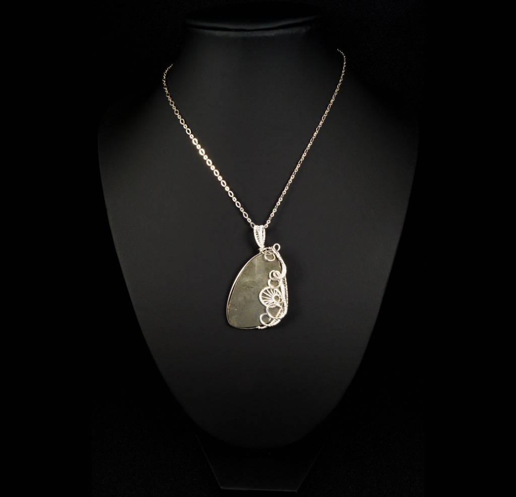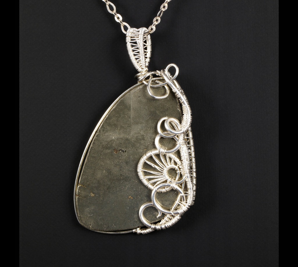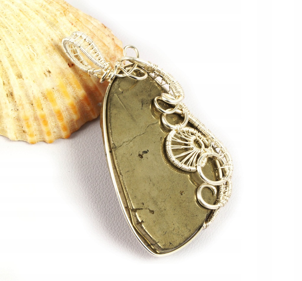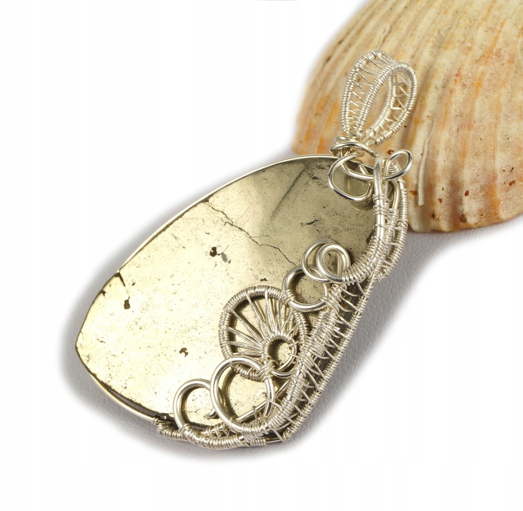 Bajeczny, misternie pleciony wisior z kaboszonem pirytu. Wisior zaprojektowany i wykonany przeze mnie od podstaw bardzo pracochłonną i precyzyjną techniką wire-wrapping ze srebra próby 925, 930 i 999.