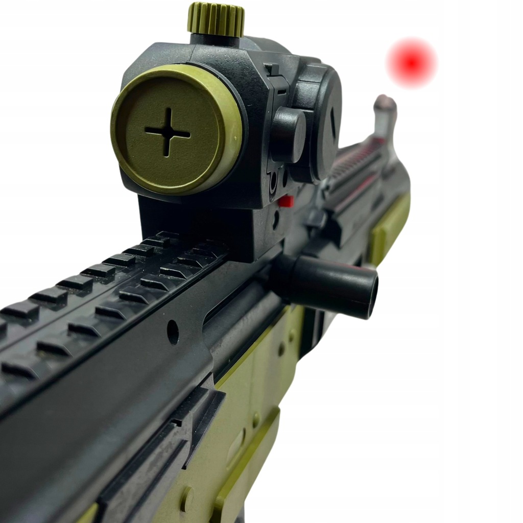 ☑️ Dodatkowy celownik na baterie, włączany przyciskiem, pomaga w celowaniu.