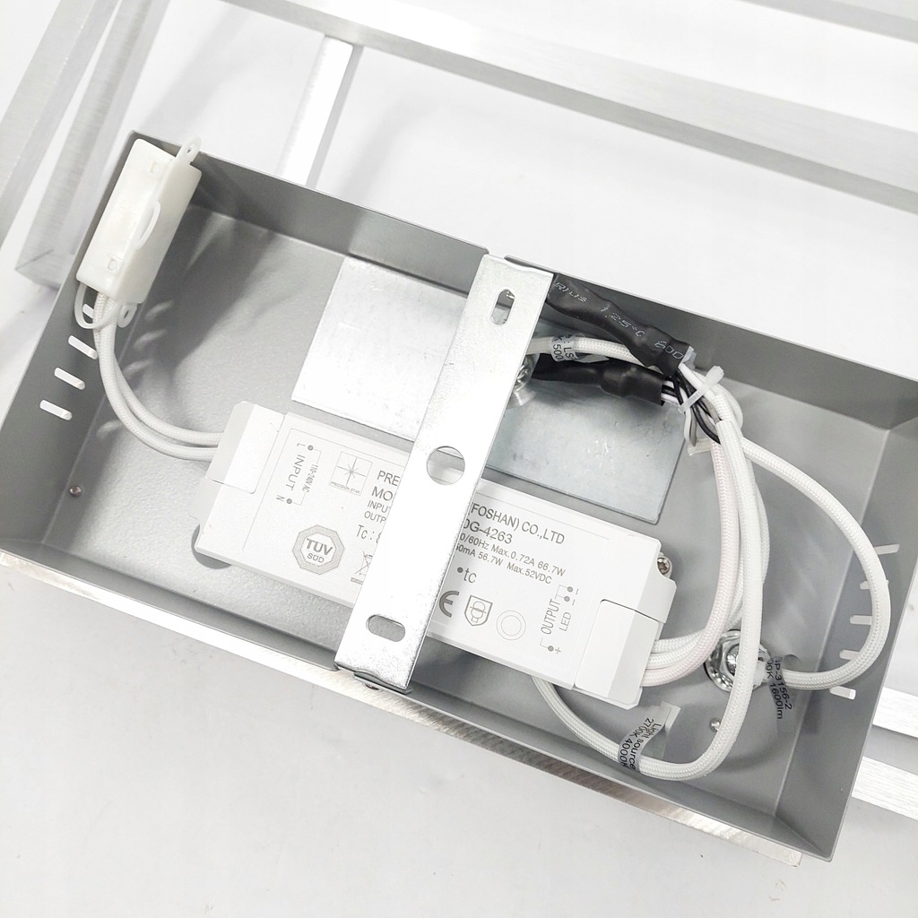 - Nowoczesna lampa sufitowa LED z trzema prostokątnymi modułami LED chrom-aluminium, wykonana z metalu z tworzywa sztucznego - metal o wyglądzie szczotkowanego aluminium, w zestawie metalowa nakładka na baldachim w kolorze chromu