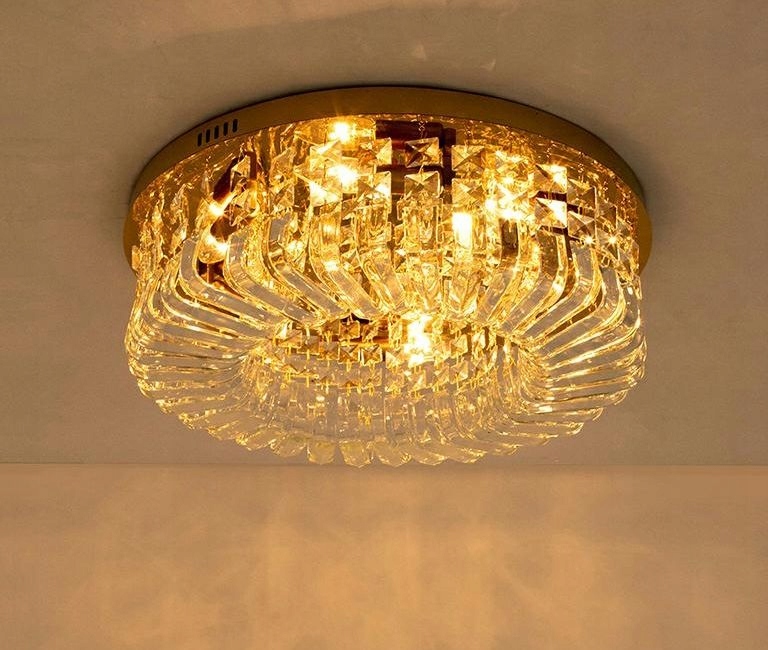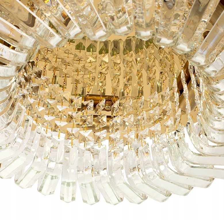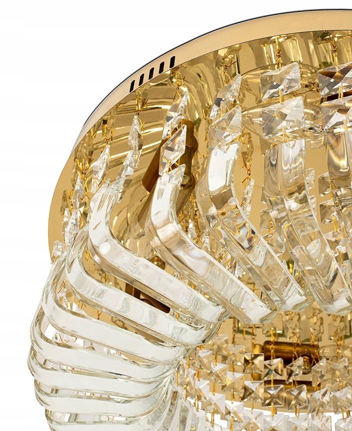 Metalowa konstrukcja o złotym odcieniu w połączeniu z kryształowymi elementami tworzy olśniewający efekt, który wspaniale rozświetla i dodaje elegancji każdemu pomieszczeniu.
