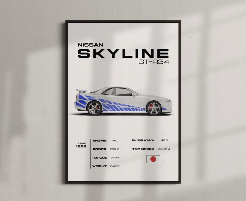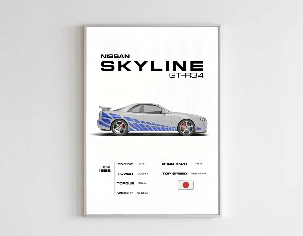 Przed Tobą plakat przedstawiający legendarnego Nissana Skyline R34 w wersji, którą zna każdy fan „Szybkich i wściekłych”. Błyszczący lakier w odcieniu srebra, charakterystyczne niebieskie pasy i sportowy sznyt sprawiają, że ten model na zawsze zapisał się w historii motoryzacji i popkultury. To nie tylko samochód — to symbol prędkości, braterstwa i wolności.