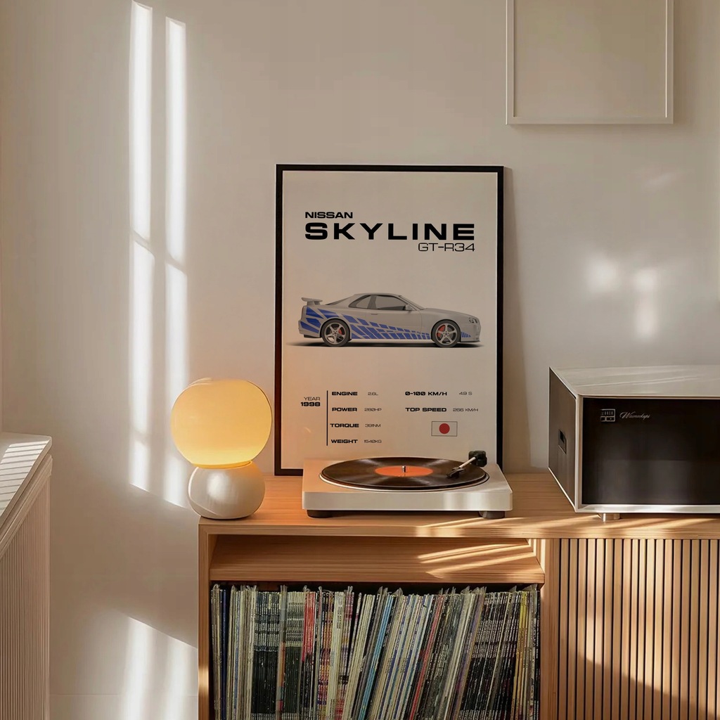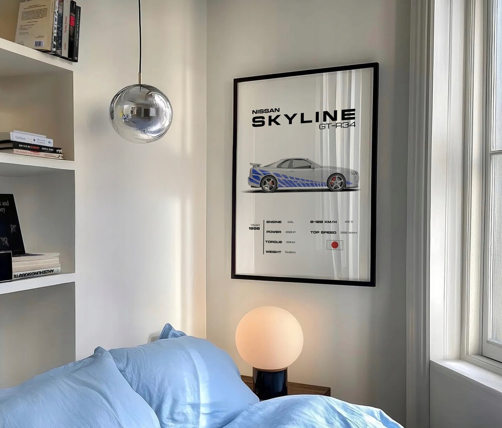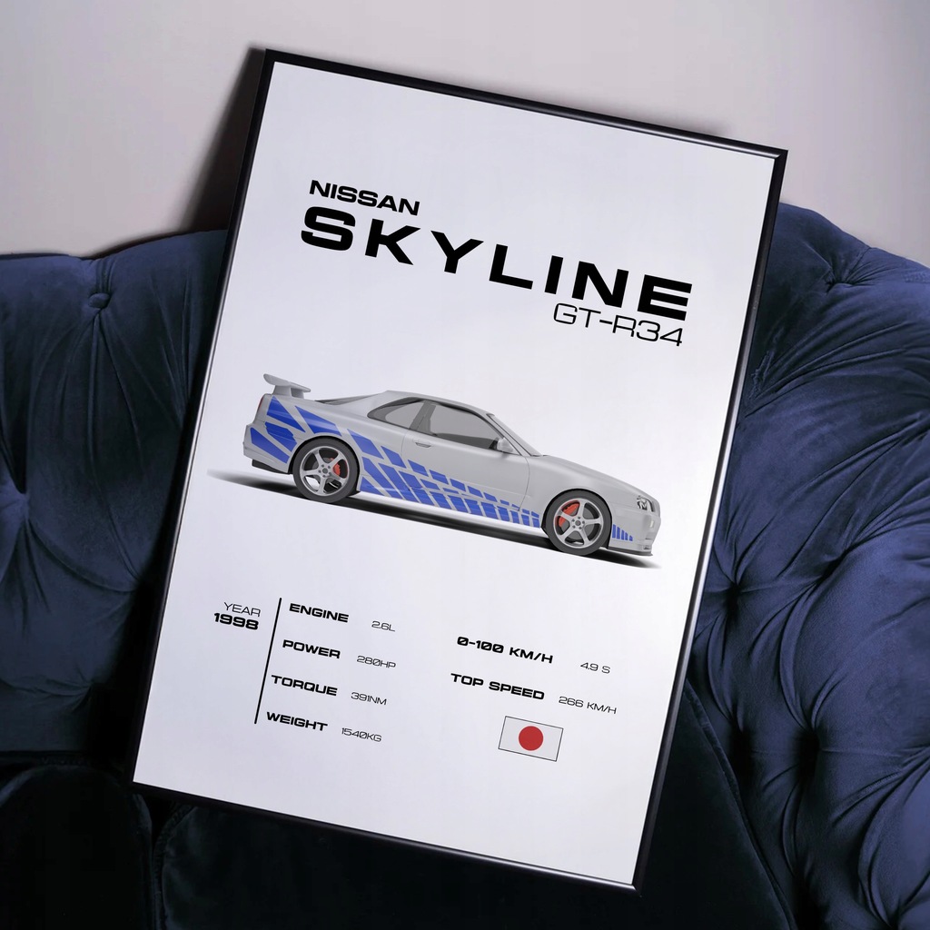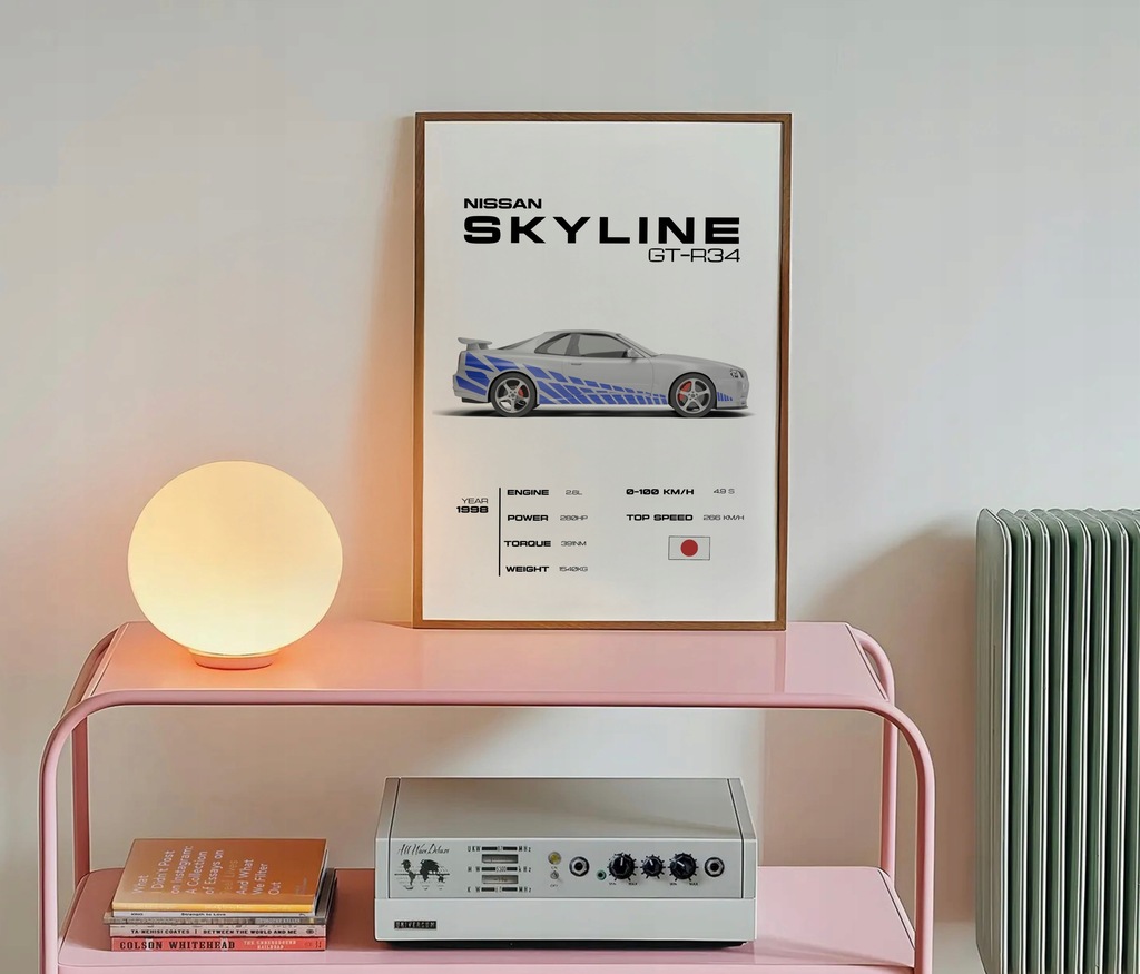 Grafika z Skyline’em R34 została wykonana przeze mnie w programie 3D — bez użycia sztucznej inteligencji. Każdy detal auta stworzyłam ręcznie, oddając hołd filmowej legendzie. Kupując ten plakat, wspierasz prawdziwą twórczość i autentyczny projekt, nie masowo generowany obrazek z generatora.