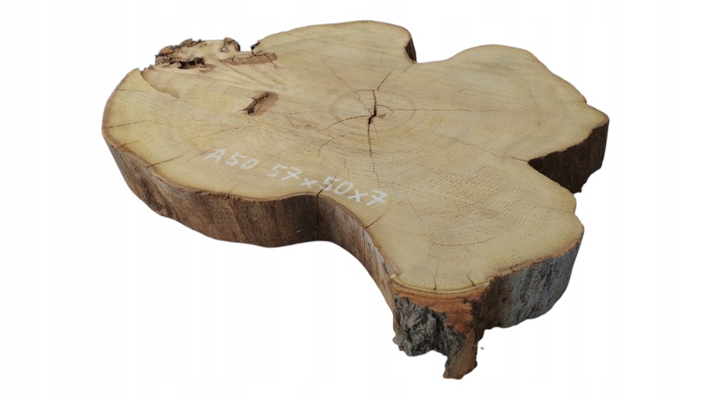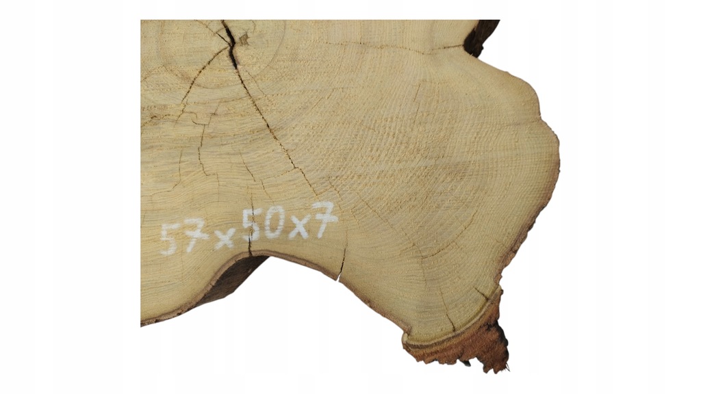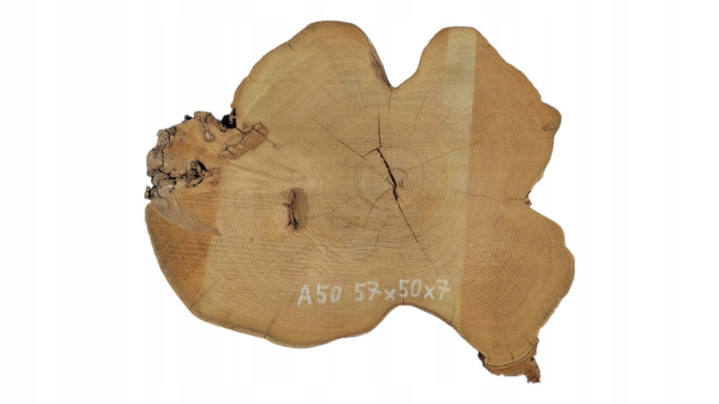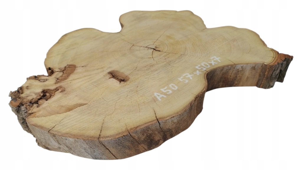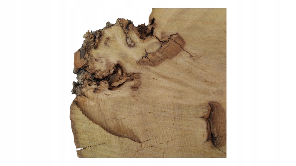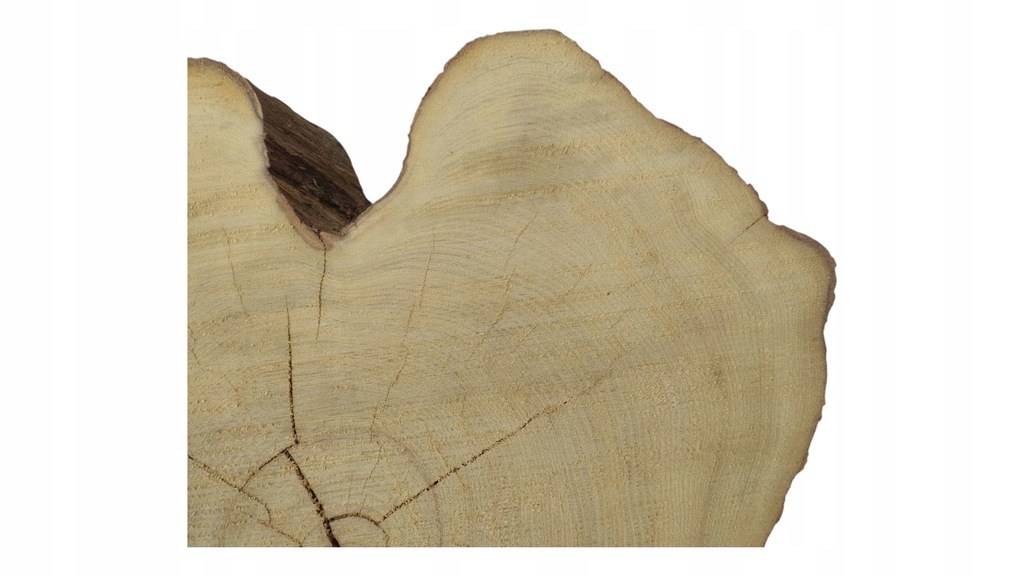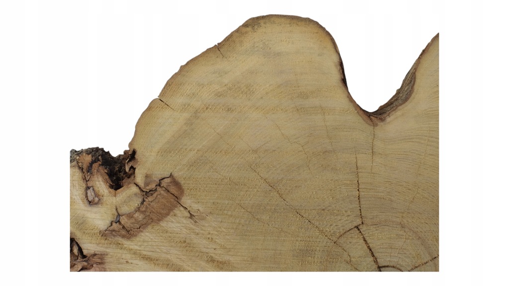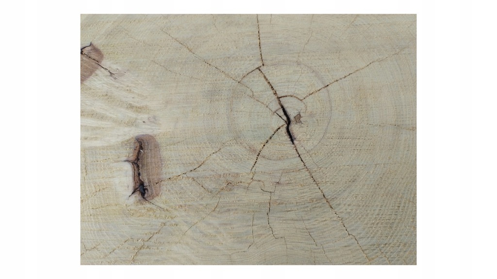 Zdjęcia robimy od razu po przecięciu, żeby jak najlepiej pokazać w jaki sposób można wyprowadzić plaster i podkreślić jego strukturę. W procesie suszenia naturalną rzeczą są pęknięcia materiału powstałe w skutek oddawania wilgoci oraz powierzchowna zmiana barwy. Zdjęcie obok(nr 2 w galerii) przedstawia stan plastra z maja 2025 - wtedy została zmierzona podana wilgotność.