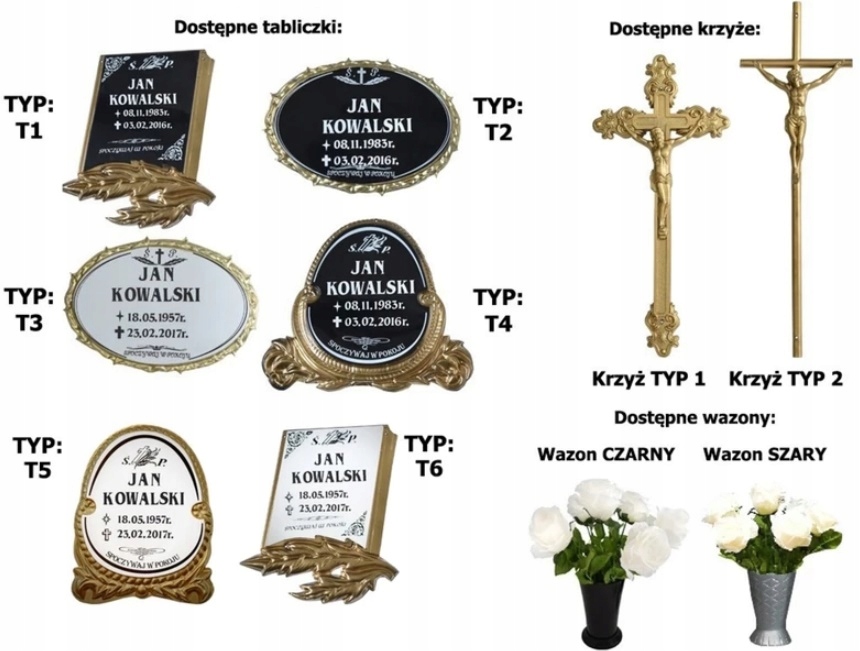 Po zakupie prosimy podać w wiadomości wybrany przez Państwa rodzaj i kolor tabliczki wraz z typem krzyża oraz kolorem wazonu a także dane osoby zmarłej.