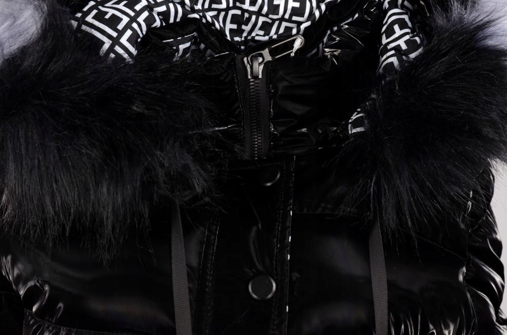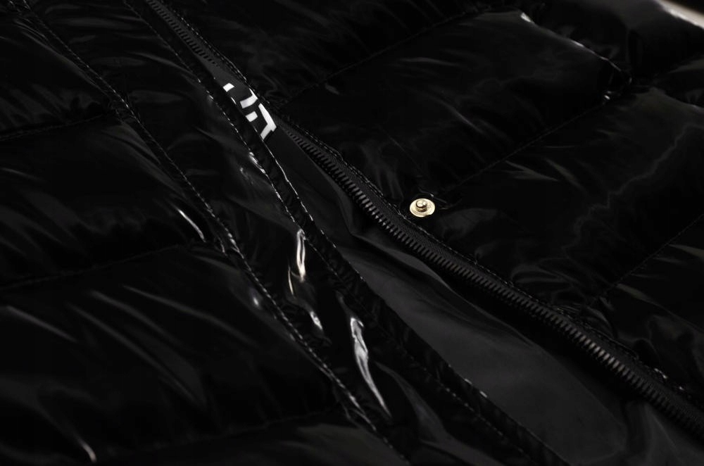 Modny płaszcz damski zimowy z połyskiem z efektem aksamitu w intensywnym czarnym kolorze. Płaszcz posiada wygodny odpinany kaptur z ciekawą podszewką oraz ślicznym dwukolorowym futerkiem, które również można odpiąć. Zasuwana jest na plastikowy dwubiegunowy solidny zamek. Z przodu dwie wygodne zasuwane kieszenie. Płaszcz puchowy damski idealnie sprawdzi się na zimę oraz na chłodniejszą jesień oraz wiosnę. Płaszcze z aksamitnego ortalionu przykuwają uwagę i są modne i stylowe. Model z lekkim taliowaniem i listwą przeciwwiatrową zapinaną na napy z przodu.