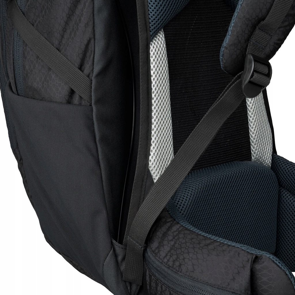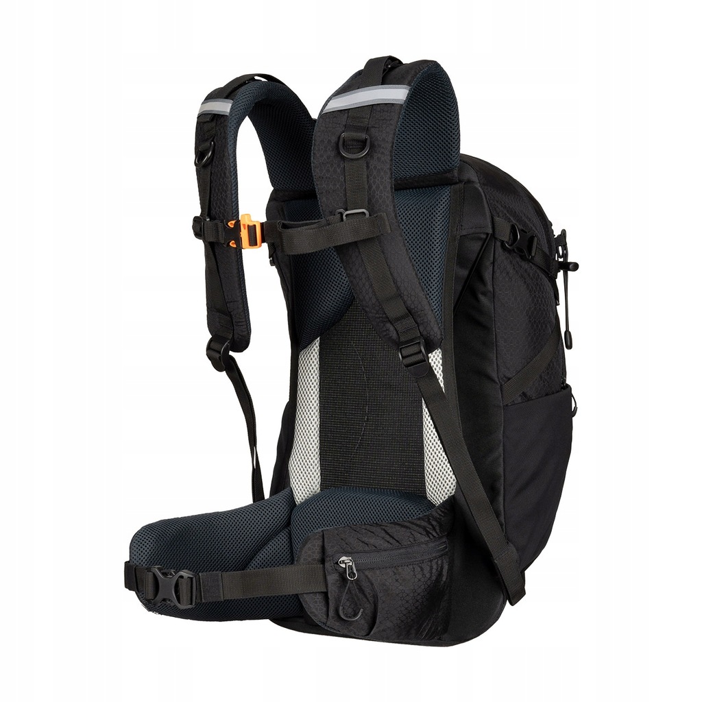 Stelaż i uzupełniające paski regulacyjne przy szelkach to rozwiązanie, które w zmiennym ukształtowaniu terenu pozwolą odciążyć plecy. Regulowany dwupoziomowo pas piersiowy pozwala dopasować plecak do sylwetki i zmienić jego ułożenie np. przy zejściu i podejściu na szlaku. Pas biodrowy od wewnętrznej strony pokryty jest miękką, oddychającą tkaniną mesh, która zapobiega otarciom w trakcie użytkowania. Komfortu dodają regulowane, anatomiczne taśmy naramienne, również pokryte materiałem mesh.