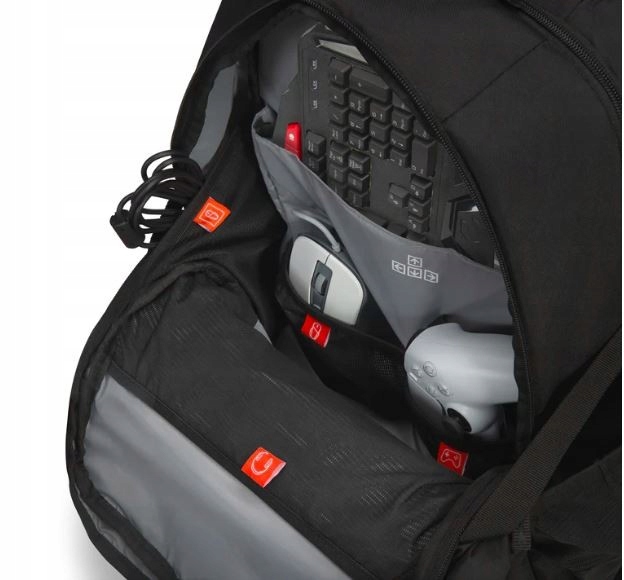 - Druga przestronna komora z wieloma wewnętrznymi kieszeniami na sprzęt do gier (mysz, klawiaturę, podkładkę pod mysz, zestaw słuchawkowy, kontroler itp.)