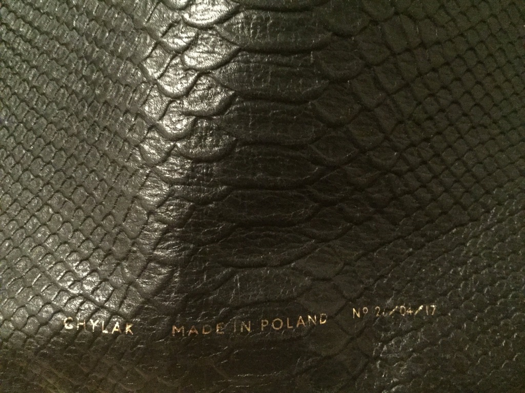 Wykonany ze skóry tłoczonej we wzór skóry pytona.
