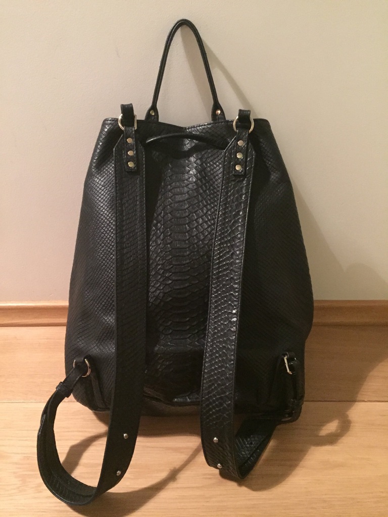 Ramiona plecaka regulowane za pomocą knopików, skórzana rączka.