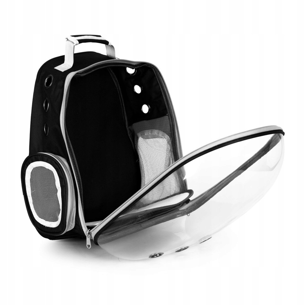 Z boku plecaka znajduje się dodatkowy otwór zapinany na zamek błyskawiczny,pozwala on na szybki dostęp do swojego zwierzaka, bez konieczności otwierania całego plecaka.