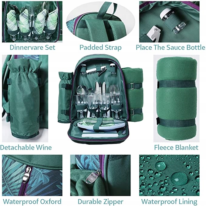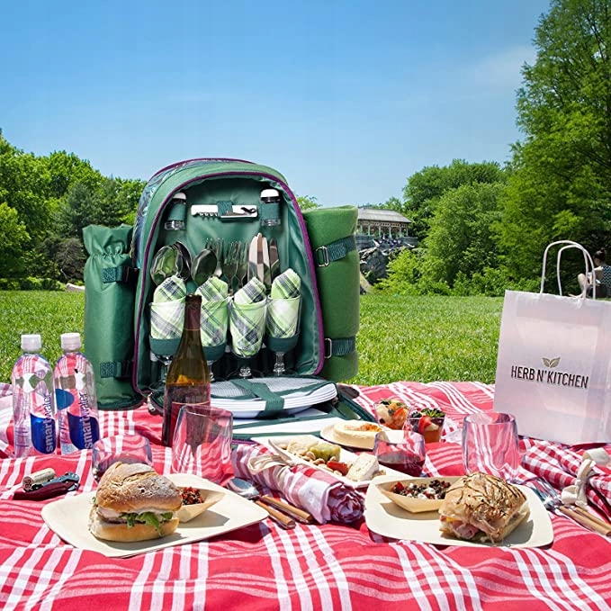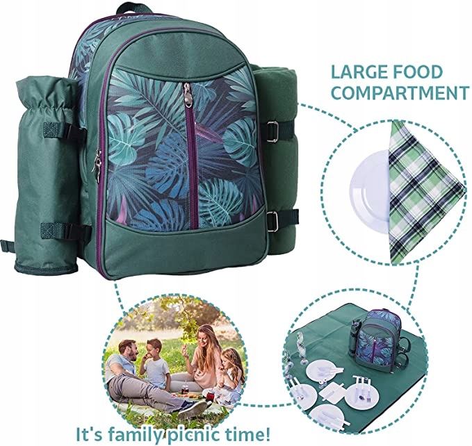 All-in-One zestaw piknikowy – 1 x plecak piknikowy, 1 x koc piknikowy. 1 x zdejmowany pojemnik na wino. Duża, izolowana komora na żywność o pojemności 20 l, może przez wiele godzin utrzymywać ciepło/zimne/świeże jedzenie lub napoje.