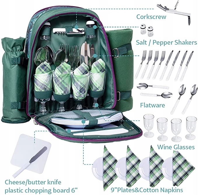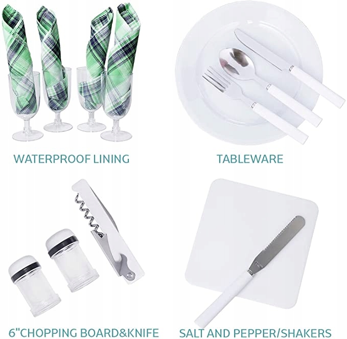 Znakomity zestaw piknikowy – 4 x talerz ceramiczny, 4 x widelec ze stali nierdzewnej, 4 x nóż ze stali nierdzewnej, 4 x łyżka ze stali nierdzewnej, 4 x kieliszki do wina, 2 x solniczka/pieprzniczka, 1 x otwieracz do butelek, 1 x ser / maselniczka i nóż.