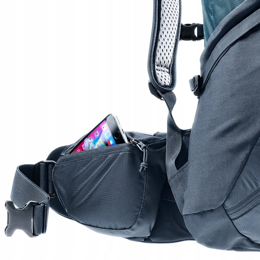Model ma trzy elastyczne kieszenie zewnętrzne, w tym jedną na przodzie i dwie na bokach oraz kieszeń na pasie biodrowym. Uchwyt na kije trekkingowe i możliwość zamocowania noszaka na kask (brak w zestawie) zwiększają funkcjonalność plecaka. W zestawie znajduje się pokrowiec przeciwdeszczowy, który chroni zawartość plecaka przed wilgocią.