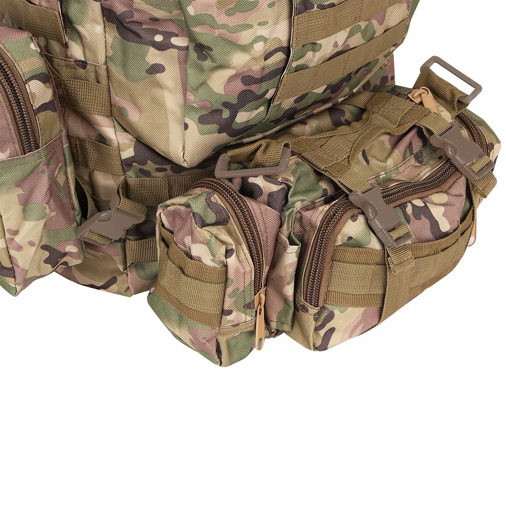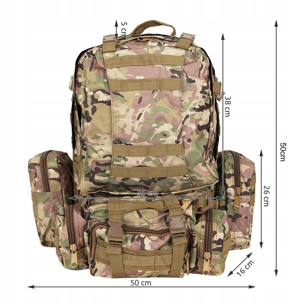 - SPECYFIKACJA - wzór: moro; materiał: tkanina oxford 900D, poszycie wewnętrzne: PVC, pozostałe: pianka EVA PE PP POM nylon żelaz; pojemność: plecak 45l nerka 3,5l; wymiary: 50 x 16 x 60 cm; waga zestawu: 1,36 kg; waga w opakowaniu: 1,4 kg.