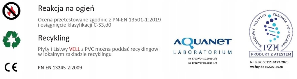 - Odporność ogniowa -zgodnie z PN-EN 13501-1:2019.