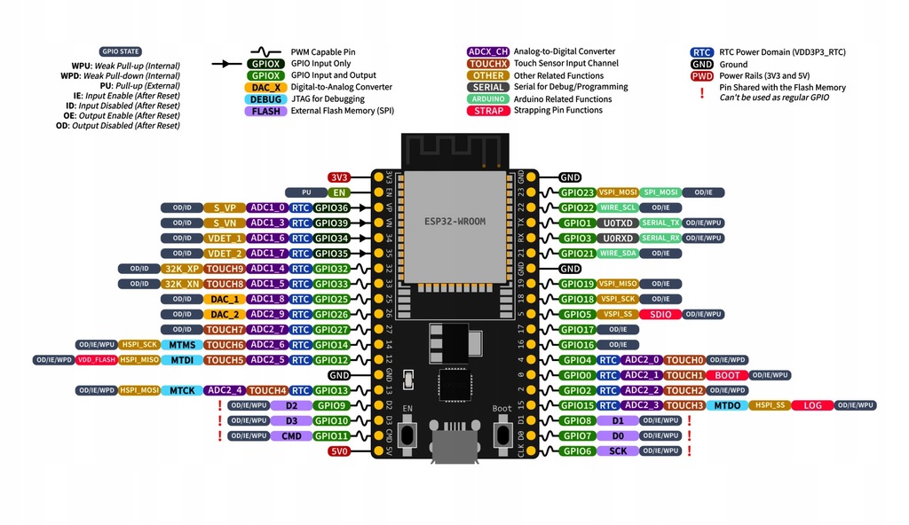 - We-Wy: SD card, UART, SPI, SDIO, I2C, LED PWM, motor PWM, I2S, IR, pulse counter, GPIO, capacitive touch sensor, ADC, DAC, TWAI® (compatible with ISO11898-1 CAN Specification 2.0)