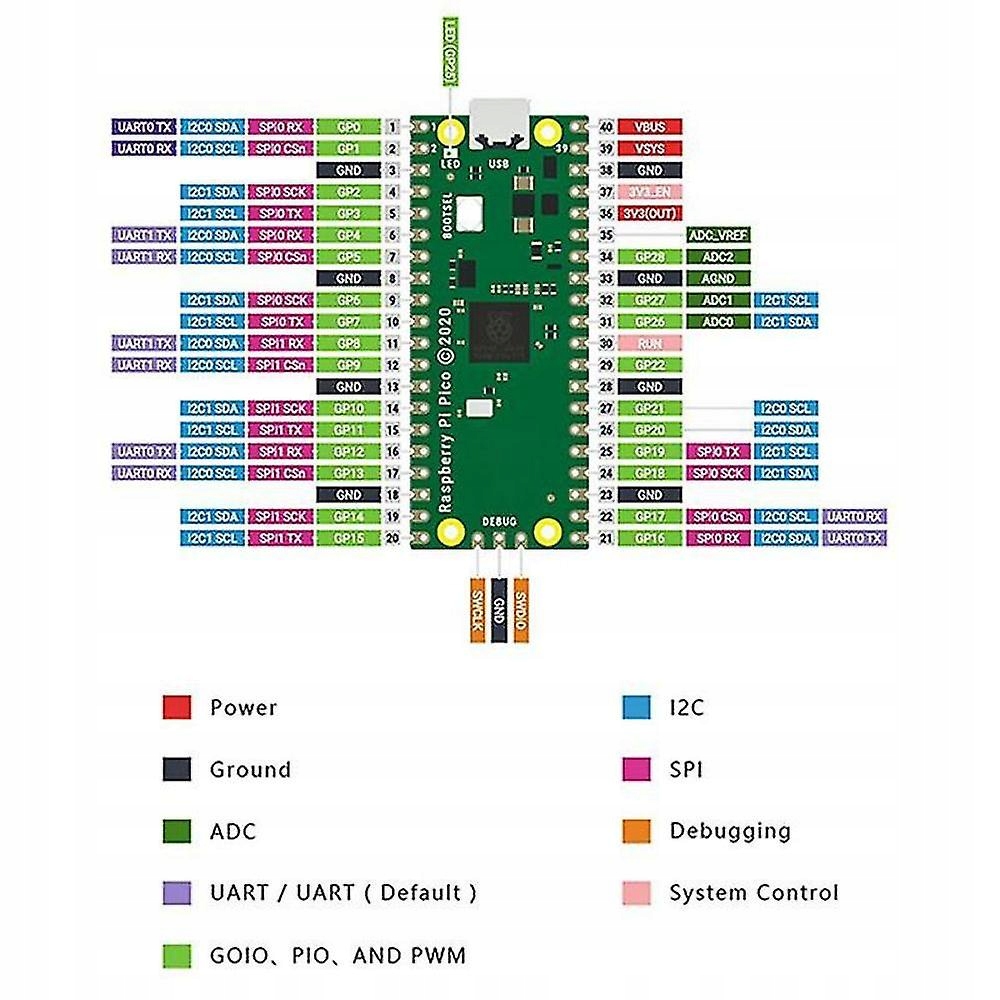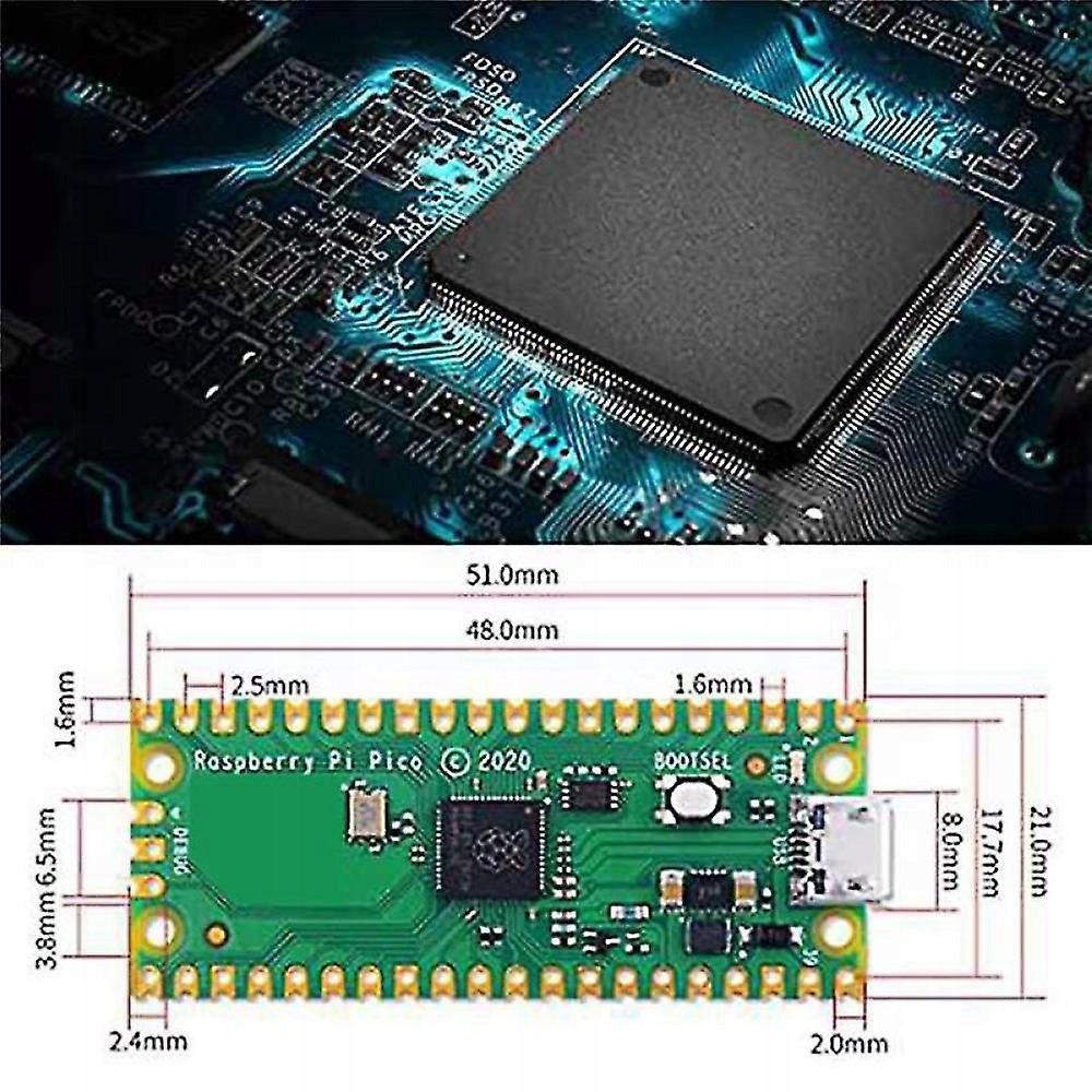 Using for Raspberry Pi1 RP2040 microcontroller chipDual-core Arm Cortex M0 processor running up to 133 MHz264KB SRAM and 2MB onboard flashCastellated modules allow direct soldering to the board8 programmable I/O (PIO) state machines for custom peripheral supportProduct Name: for PicoControl chip: RP2040 (ARM Cortex MO dual-core 133MHz processor 264KSRAM)Flash: 2MByteUSB port type: -USB supply mode: USB-5V, VSYS-1.8V-5.5VSupply voltage: 5VOutput voltage: 5V/3.3VGPIO level: 3.3VWorking current: not more than 300mAWorking temperature: -20-80Number of pins: 40 pin Accuracy: 12-bit 500KPS Development language: -Python.C, C Burning : recognized as mass drag-and-drop downloadDevelopment Environment: Studio Code, Material: PCBColor: GreenProduct Size: 51 x 21mmPackage Contents:1 x Development Board1 x Pin Header1 x USB CableOnly the above package content, other products are not included.Note: Light reflection and different displays may the color of the item in the a little different from the real thing. The measurement allowed error is /- 1-3cm.