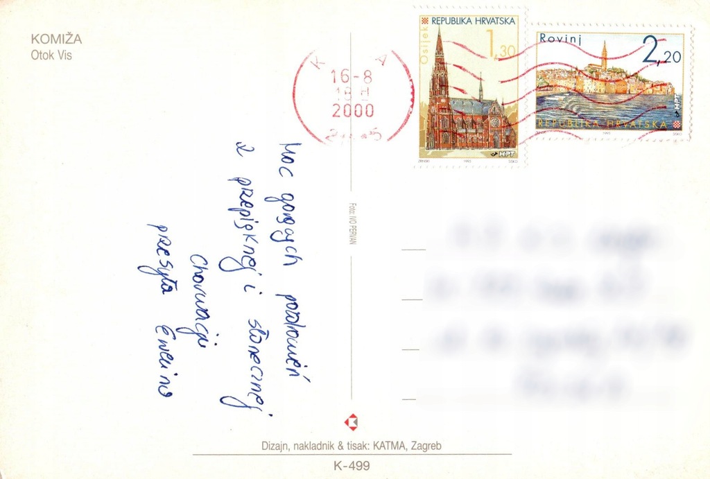 - Treść korespondencji: Krótkie pozdrowienia napisane odręcznie po polsku, niebieskim długopisem.