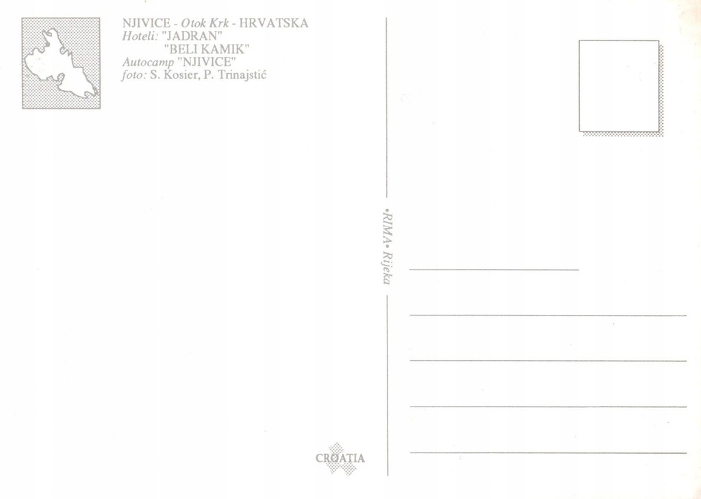 - Górne zdjęcie: Widok na nabrzeże z białymi budynkami o czerwonych dachach. Na pierwszym planie spokojne wody zatoki z łódką z kilkoma osobami. W tle zabudowania Njivice wznoszące się po zboczu porośniętym zielenią.