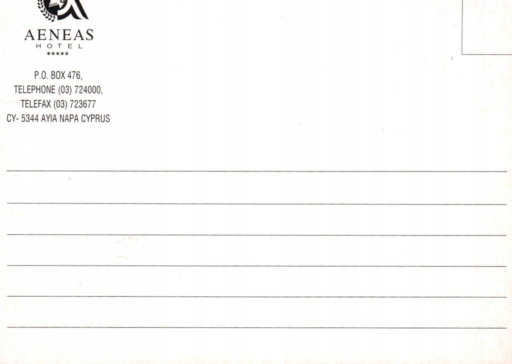 Ta pocztówka przedstawia efektowny widok kompleksu hotelowego Aeneas Hotel w Ayia Napa, Cypr, ukazując rozległy basen z otaczającą go strefą wypoczynkową oraz fragment relaksującego jacuzzi.