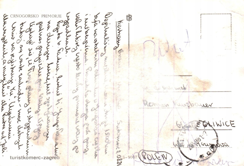 - Kartka była w obiegu – zawiera adres odbiorcy w Polsce (Gliwice), treść odręczną i datownik pocztowy.