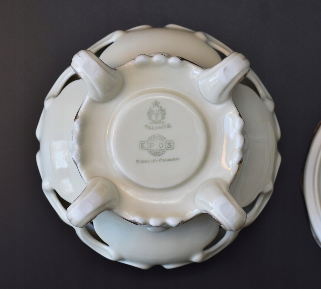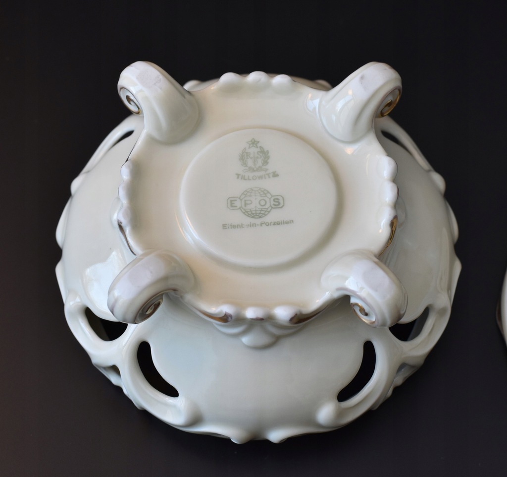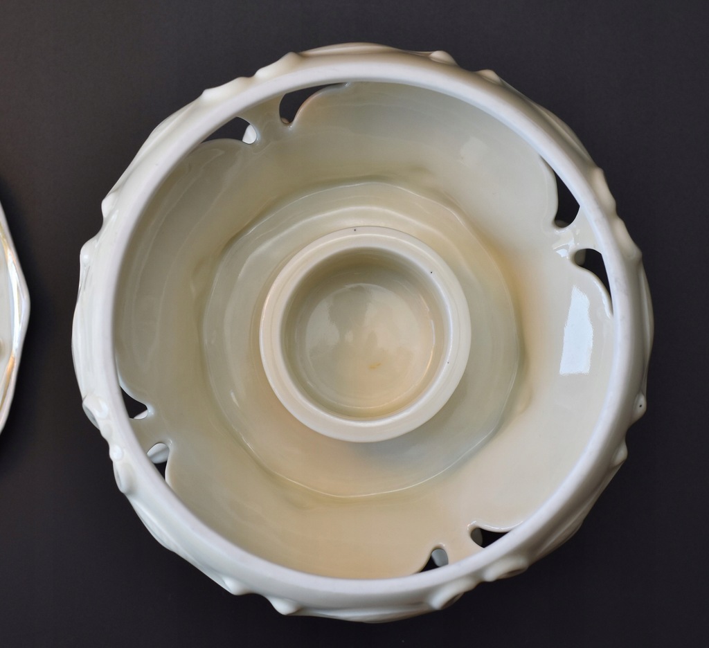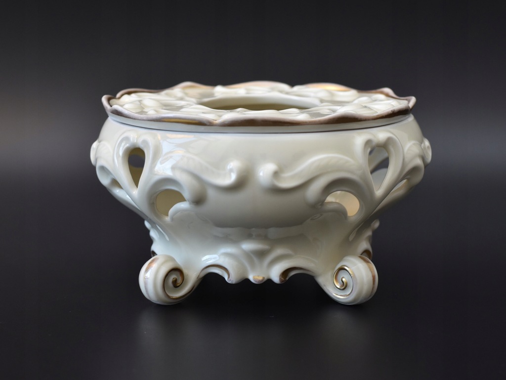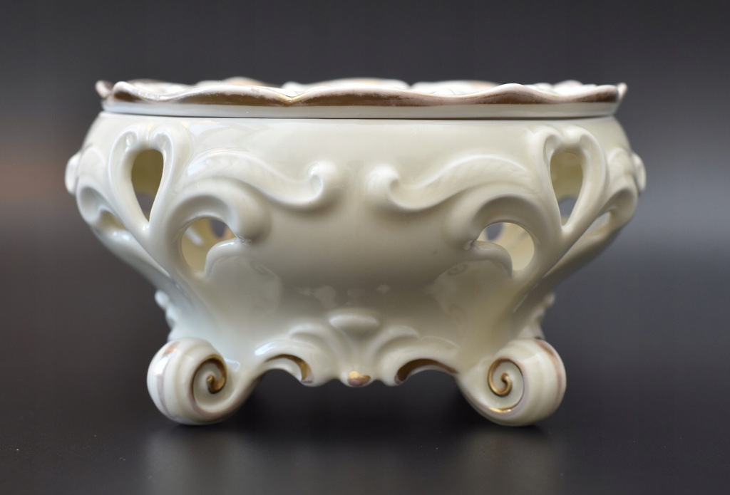 Porcelana w kolorze ecru z delikatnymi złoceniami. Forma osadzona na czterech rzeźbionych nóżkach, całość zdobiona reliefami i ażurami.