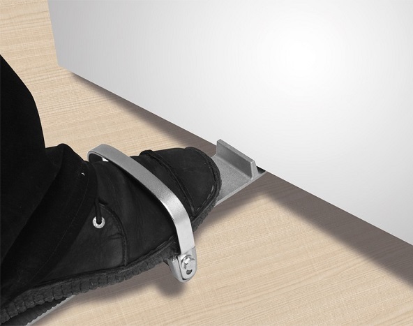 - Naciskając stopą na nasuniętą na but, wspartą o podłogę, dźwignie, unosimy stojące na niej drzwi do żądanej wysokości i swobodnie manewrując nakładamy na zawiasy.