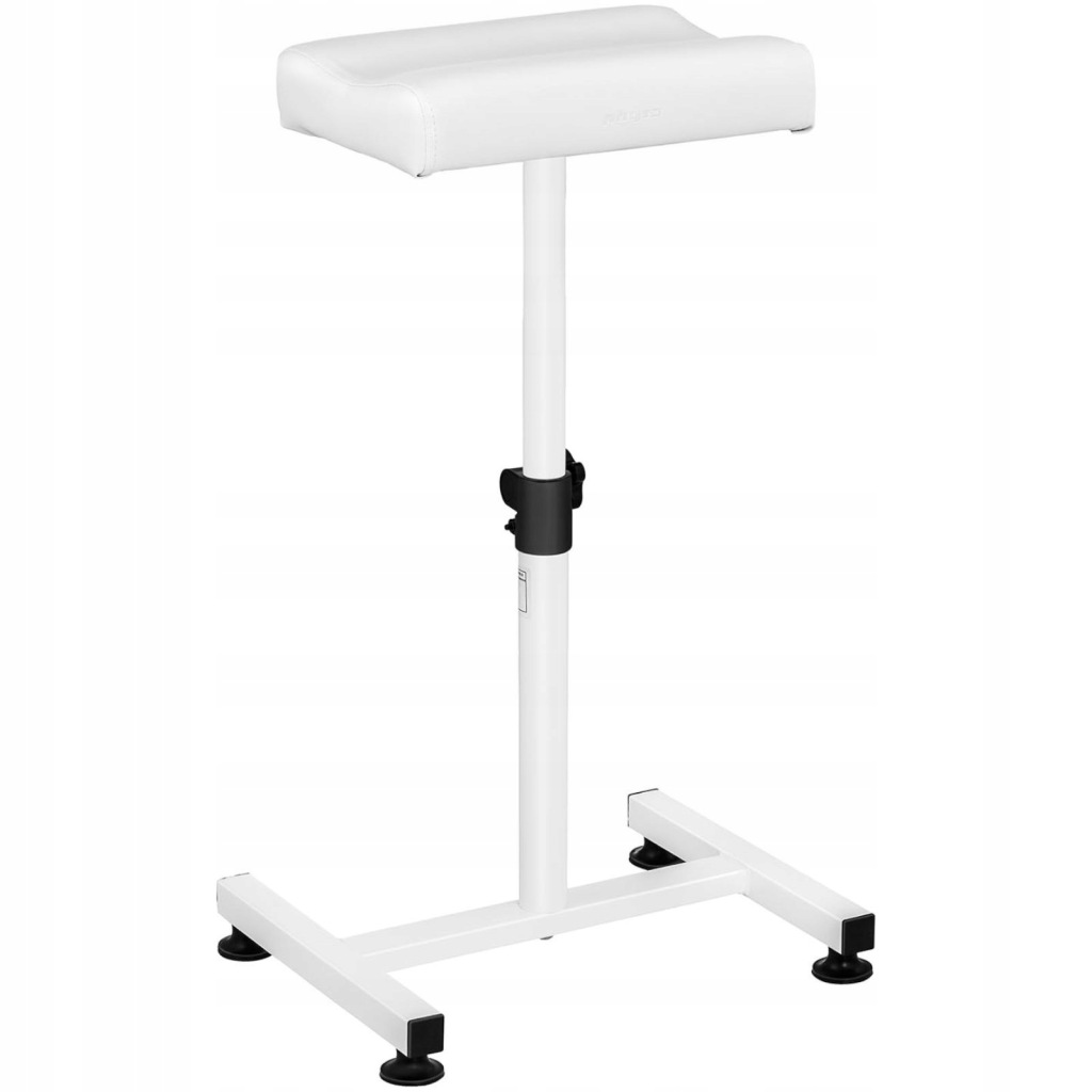 Podnóżek ma wymiary 24 x 33 cm, wypełniony został miękką pianką i pokryty skórą syntetyczną. Skutecznie niweluje zmęczenie i zapewnia komfort podczas długotrwałego zabiegu. Stabilność stołka zapewniają antypoślizgowe nóżki. Wysokość można regulować do 75 cm odkręcając pokrętło pod siedziskiem, przesuwając podparcie w górę lub w dół i dokręcając pokrętło. Maksymalne obciążenie to 80 kg. Elegancki wygląd to zasługa zastosowania białej skóry oraz stelaża w tym samym kolorze. Dzięki temu podnóżek łatwo jest także utrzymać w czystości.