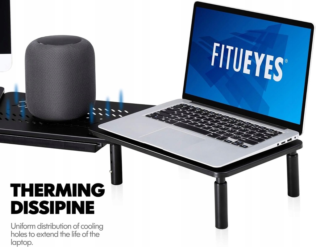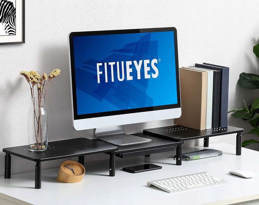 Stojak FITUEYES na podwójny monitor - 3 półkowy monitor komputerowy Riser z uchwytem na telefon komórkowy, stojak na biurko z regulowaną długością i kątem, akcesoria na biurko, artykuły biurowe.
