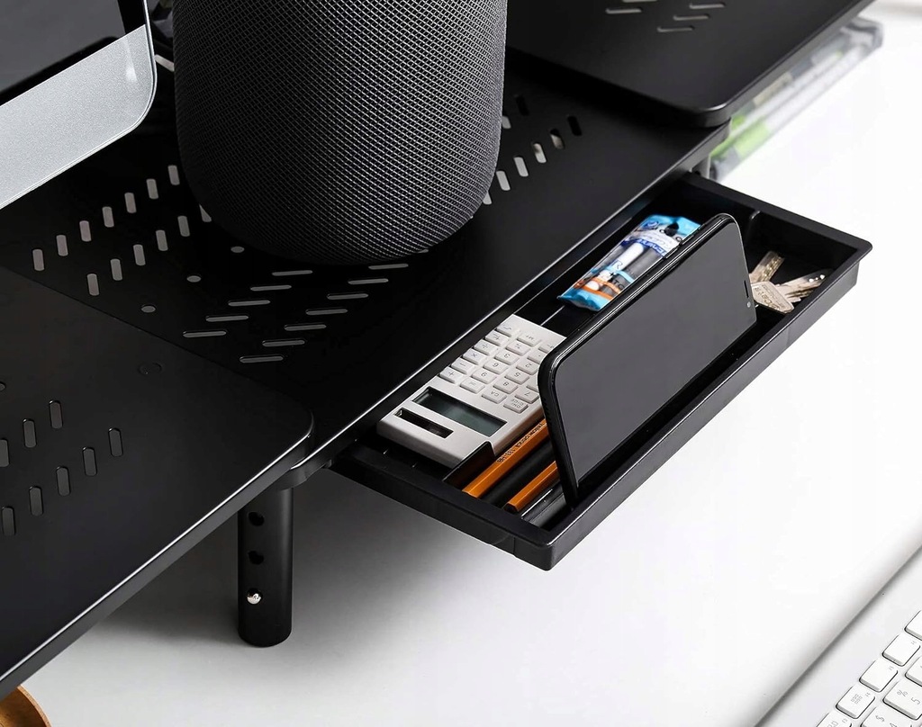 - Półka do organizacji biurka: Dodatkowa przestrzeń do przechowywania przy jednoczesnej poprawie wysokości wyświetlacza komputera. Płytkie wycięcie może pomieścić tablety i telefony z podłączonymi kablami do transmisji danych. Są wystarczająco przestronne, aby pomieścić wiele rzeczy, takich jak wydatki, papier, spinacze do papieru.
