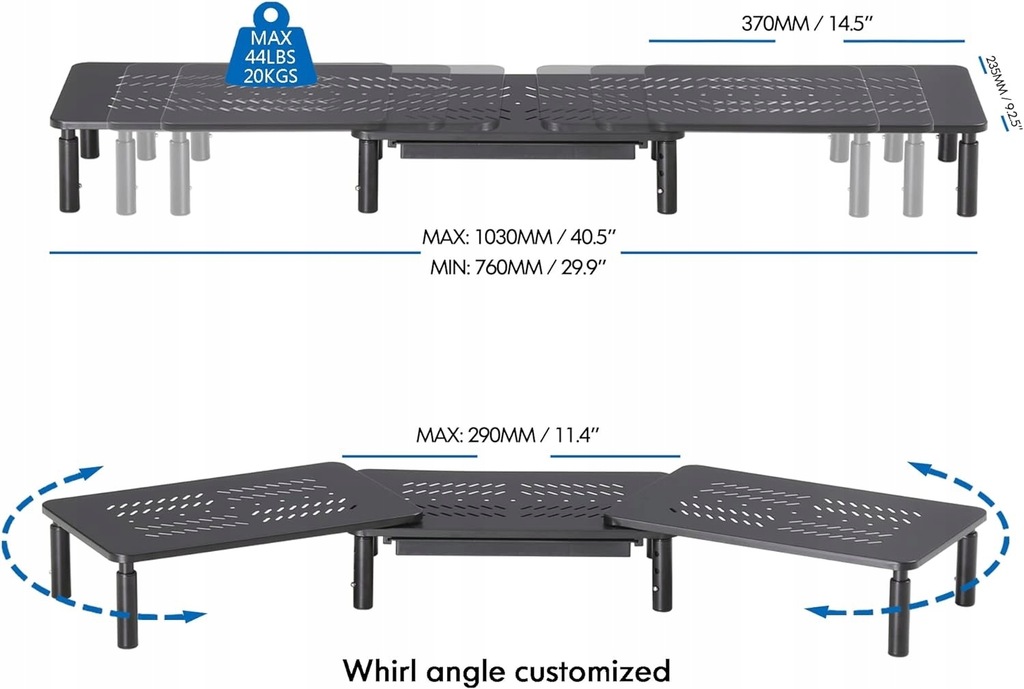 Dłuższy rozmiar i więcej miejsca: Przy najdłuższej szerokości 42,7 cala ta podstawka do laptopa jest wystarczająco duża, aby obsługiwać dwa monitory. W zależności od konfiguracji możesz nawet mieć miejsce na umieszczenie głośnika lub innego urządzenia pośrodku. Tworzy pod spodem wystarczająco dużo miejsca na mniejsze akcesoria na biurko lub na schowanie klawiatury i myszy.