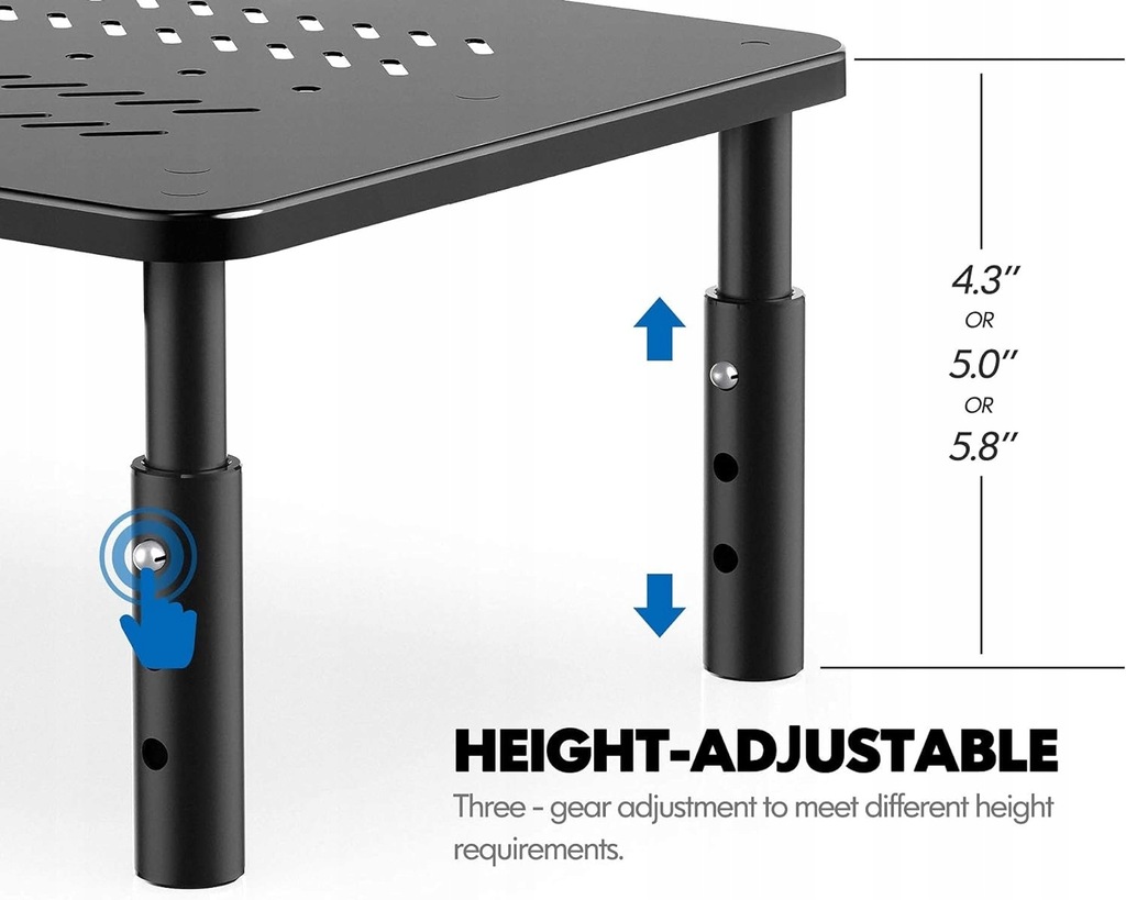 - Podniesienie monitora do wygodnej wysokości: Pozwala usiąść prosto, skutecznie zmniejszając obciążenie szyi i kręgosłupa. Poprawiona postawa sprawi, że będziesz się bardziej skupić. Ten pion do laptopa ma 3 ustawienia wysokości. Możesz ustawić wysokość na 3,9'', 4,6'' lub 5,4''.