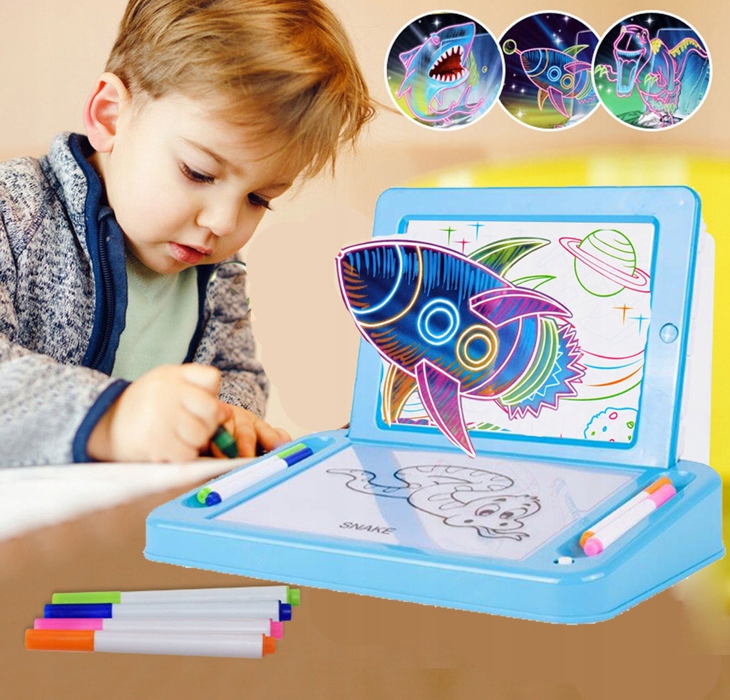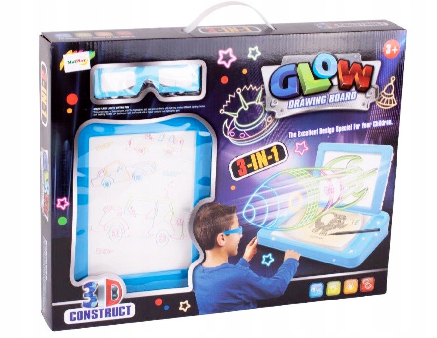 Magiczna tablica 3D zapewni fantastyczne emocje zarówno dzieciom jak i dorosłym. Aby stworzyć rysunek z efektami 3D, należy włożyć do tablicy jeden z szablonów i odrysować obrazek na przeźroczystym ekranie. Następnie najlepiej należy udać się do ciemnego pomieszczenia, założyć okulary 3D z zestawu i włączyć podświetlenie tablicy. Ukaże się wtedy wspaniały obrazek, który zachwyci każdego małego artystę.