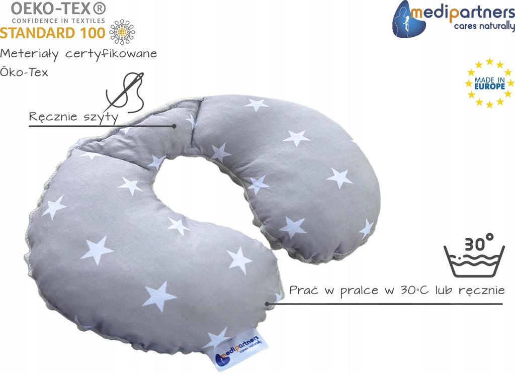 Poduszka wyprodukowana jest z najlepszych jakościowo materiałów, posiadających certyfikaty: „Oeko-Tex” standard 100, Bezpieczny dla dziecka oraz Bezpieczny dla niemowląt.