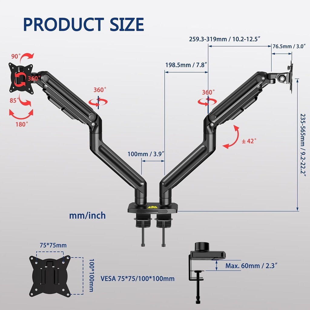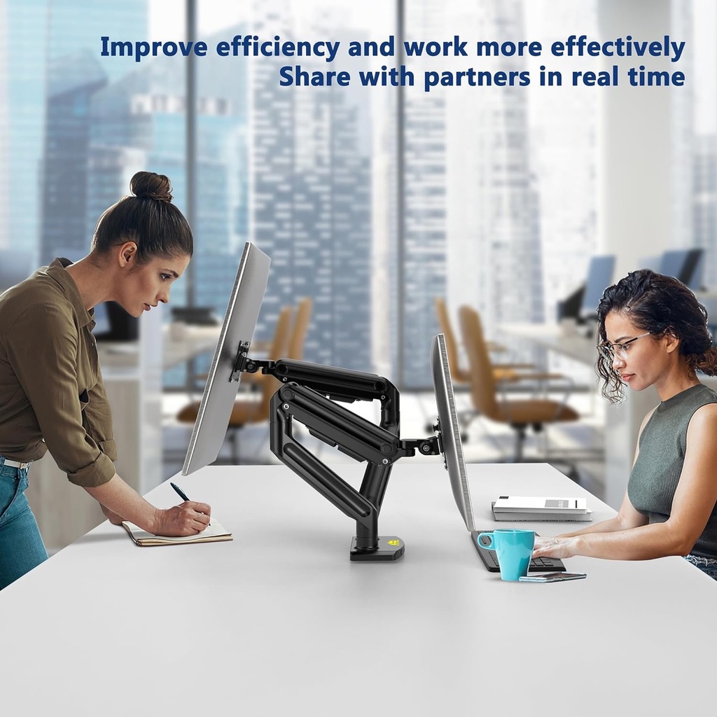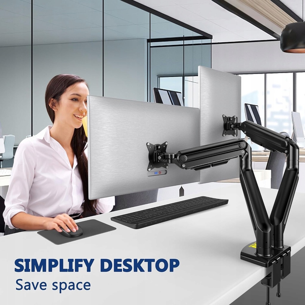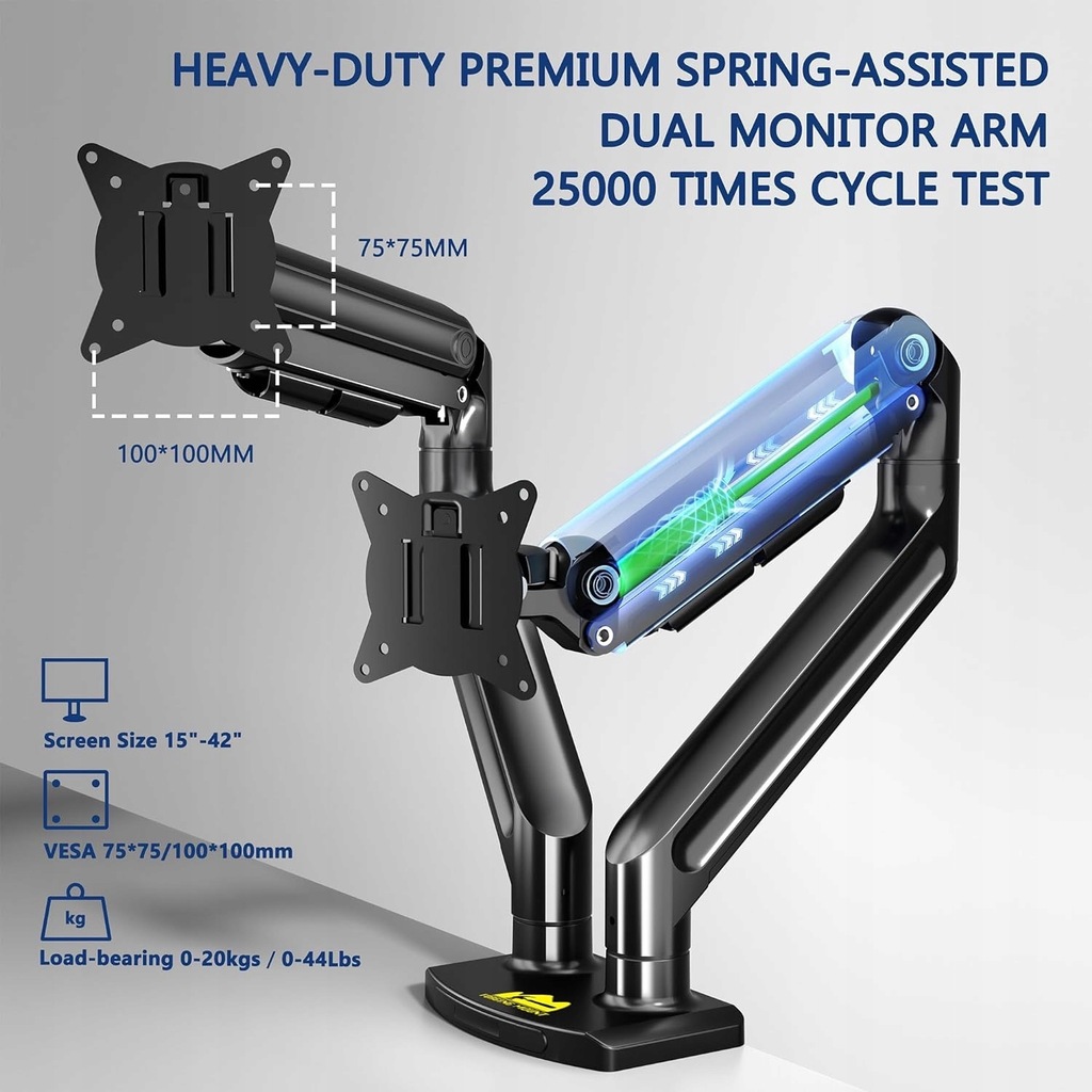 Wytrzymałe podwójne ramiona monitora - Mocowanie na biurku Sprężyna gazowa Podstawka podmonitor komputerowy Pasuje do 15-42 cali, Podwójny pełny ruch z regulacją wysokości z podstawązaciskową i przelotką, każde ramię wytrzymuje do 20kg.