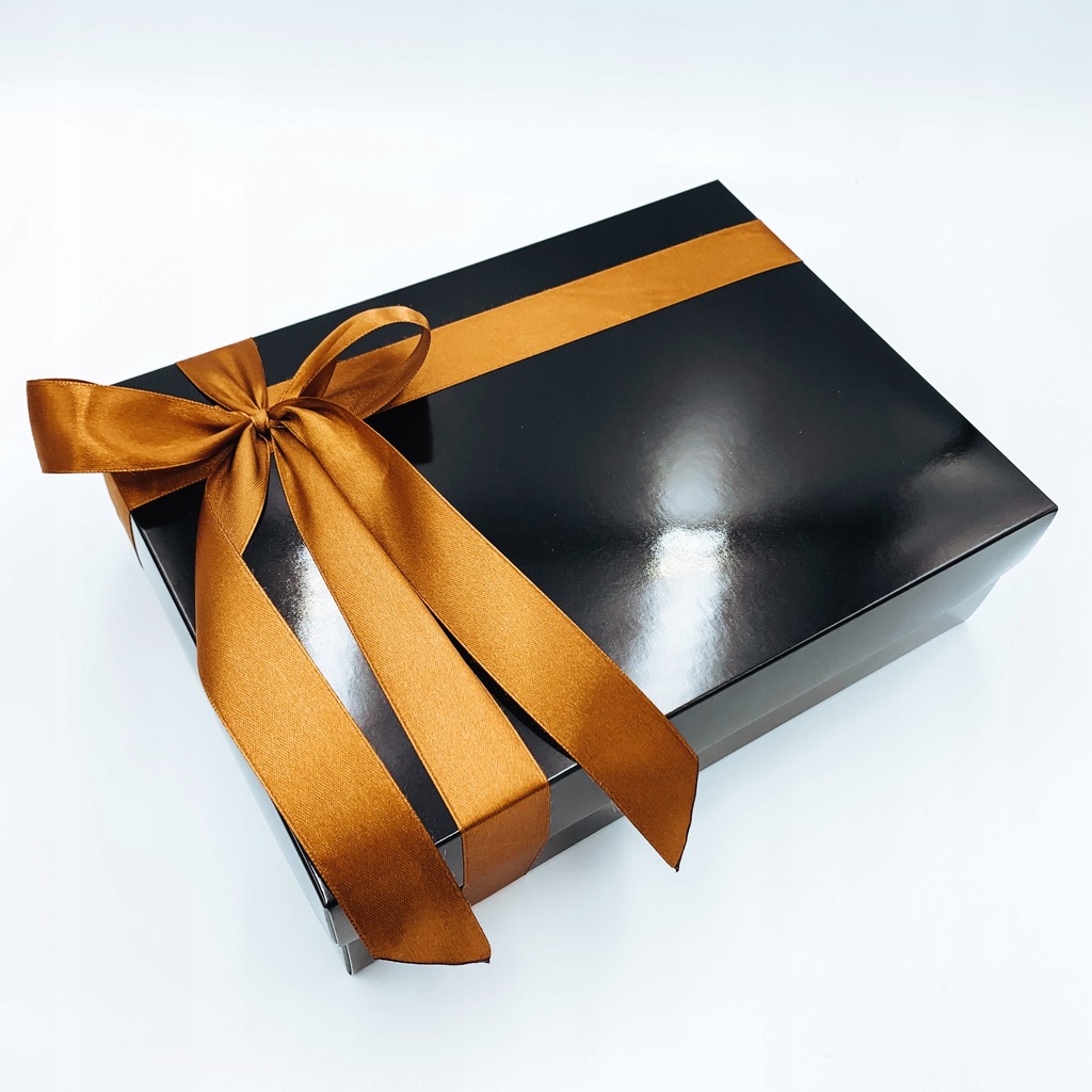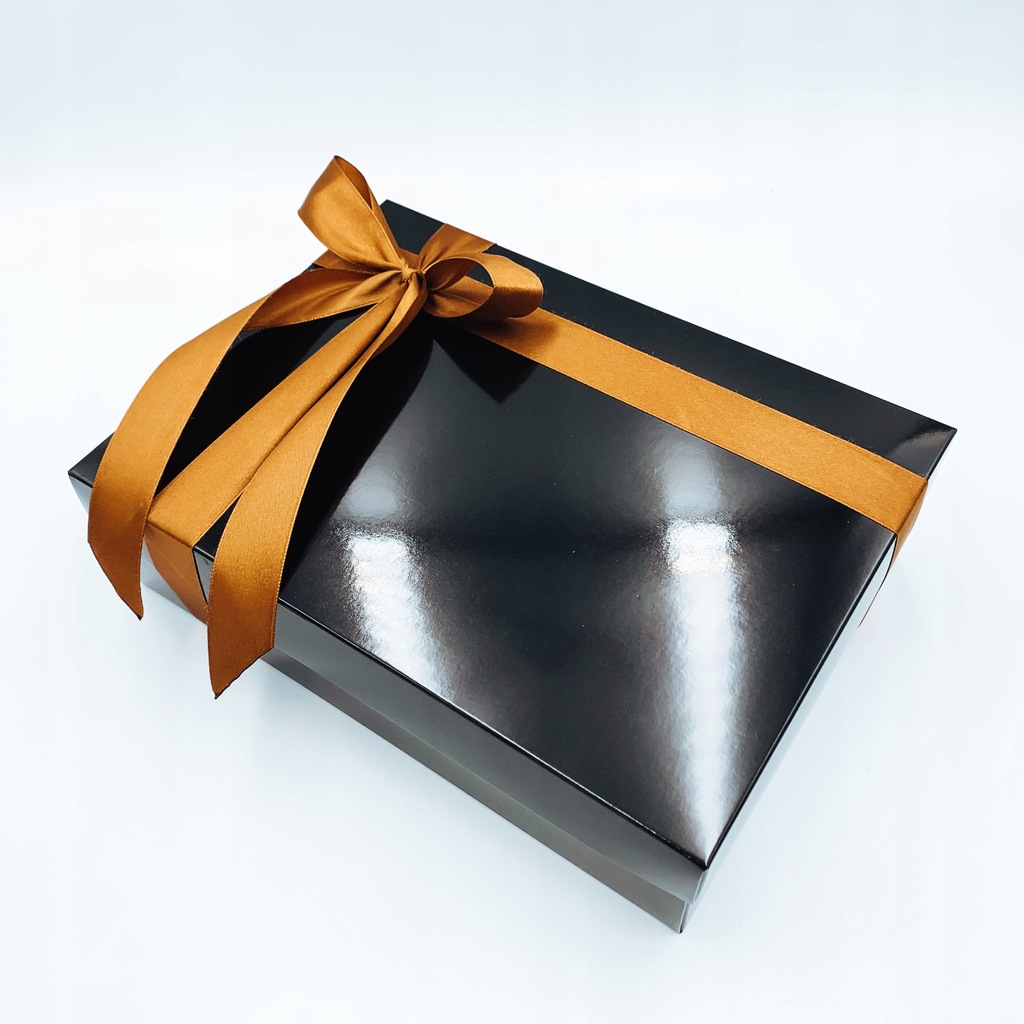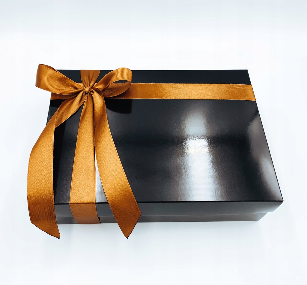 Pudełko zamykane osobnym wieczkiem, przewiązane w elegancki sposób złotą / miedzianą wstążką.