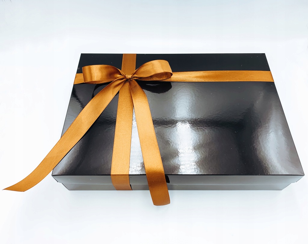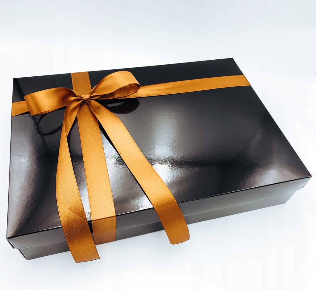 Pudełko zamykane osobnym wieczkiem, przewiązane w elegancki sposób złotą/miedzianą wstążką.