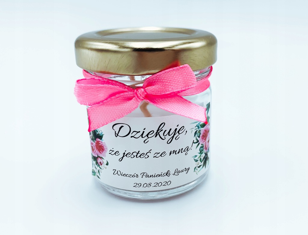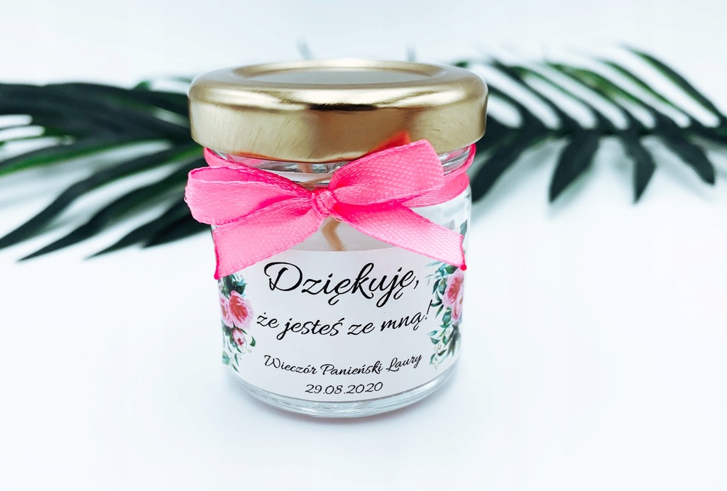 Na słoiczku naklejona jest etykieta z podziękowaniem oraz napisem "Wieczór Panieński (np. Laury)" wraz z datą. Na etykiecie znajduje się ozdobna grafika.
