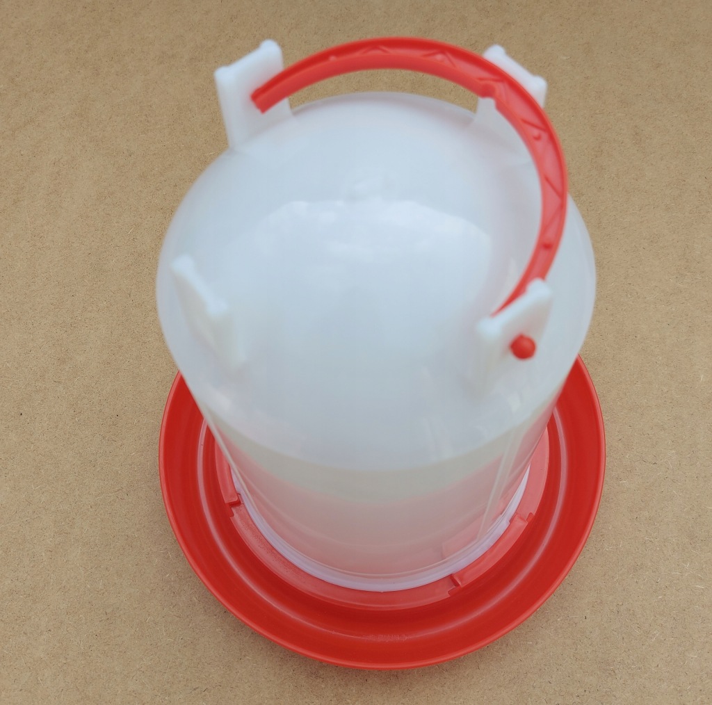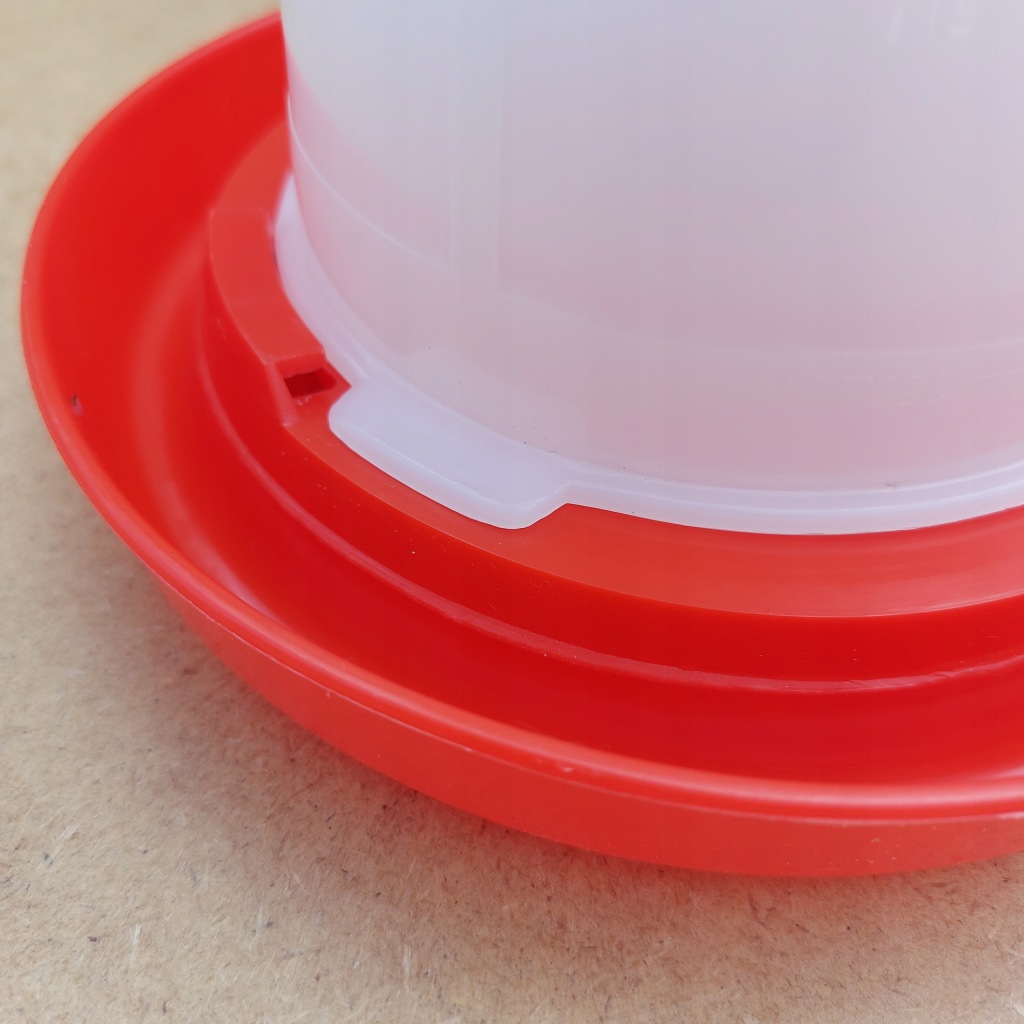 - Woda w poidle uzupełnia się grawitacyjnie, na zasadzie różnicy ciśnień, wystarczy napełnić baniak, dokręcić misę i odwrócić.