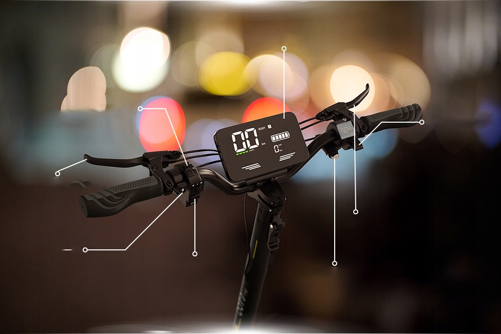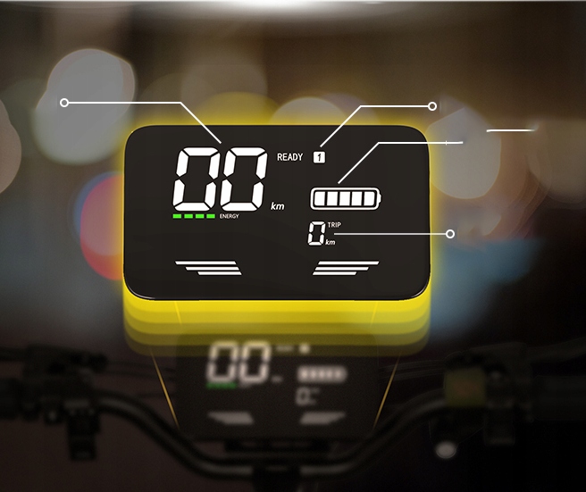 Wyraźny i jasny duży wyświetlacz pozwala w czasie rzeczywistym sprawdzić aktualną prędkość, bieg, poziom naładowania akumulatora i całkowity przebieg.