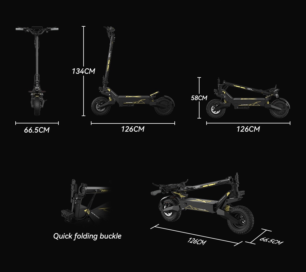 140mm Podwójne hamulce tarczowe + Antypoślizgowa podstawa, zatrzymanie szybkie jak błyskawica. Przedni i tylny podwójny hamulec tarczowy poprawia szybkość reakcji o 30% i może natychmiast zatrzymać się nawet przy prędkości 50 km/h.