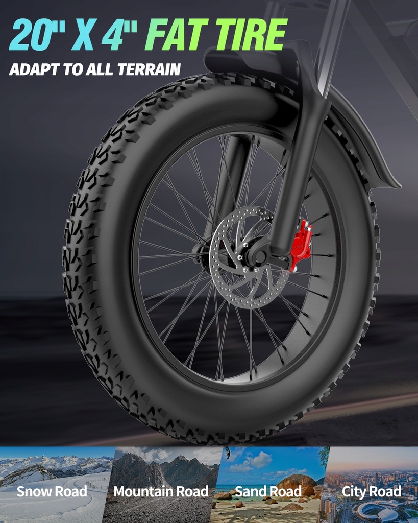 WYGODNY I BEZPIECZNY: Rower elektryczny dla dorosłych ma grube opony 20„ x 4,0”, zapewniające lepszą przyczepność i płynniejszą jazdę, a także podwójne zawieszenie (przedni widelec i tylny amortyzator), aby zmniejszyć nierówności na nierównych drogach. Posiada również trzy tryby jazdy, podwójne hamulce hydrauliczne, jasny reflektor LED, klakson i tylne światło, a także wysokiej jakości wyświetlacz LCD pokazujący prędkość, poziom naładowania baterii i przebytą odległość