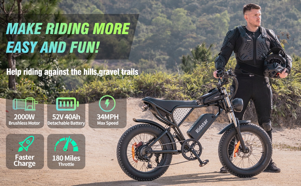Akumulator 52 V 40 Ah o bardzo dużym zasięgu: Elektryczny rower terenowy Q20 pro dla dorosłych jest wyposażony w podwójne akumulatory 52 V 20 Ah (łącznie 40 Ah), które posiadają certyfikat UL i system BMS. Każde ładowanie może zapewnić do 180 mil jazdy wspomaganej pedałami, spełniając wszystkie oczekiwania dotyczące odległości i pozwalając na jazdę w dowolnym miejscu