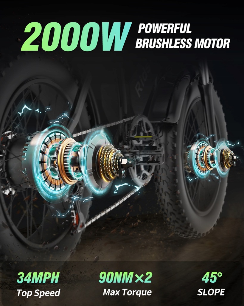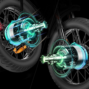 Podwójny silnik: Rowery elektryczne Q20 Pro dla dorosłych są wyposażone w podwójne silniki bezszczotkowe o łącznej mocy , od 0 do 3 sekund do 37 mil na godzinę, zapewniając podwójną moc dla maksymalnej prędkości 37 mil na godzinę i 45 ° wznoszenia. Dzięki 7-biegowemu systemowi przekładni Shamano pokonywanie stromych wzniesień nigdy nie było łatwiejsze, pozwalając na odkrywanie nowych miejsc z pewnością siebie. Podczas jazdy można wybrać tryb pojedynczego lub podwójnego silnika