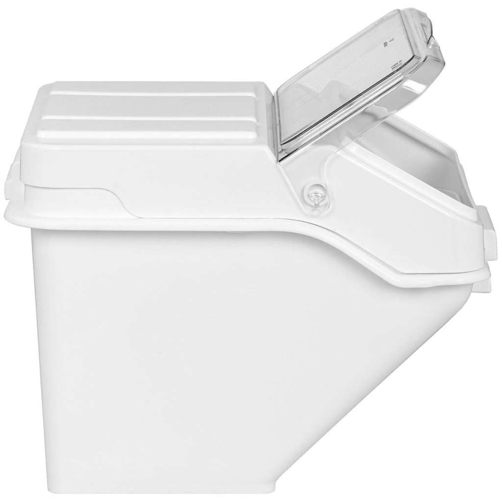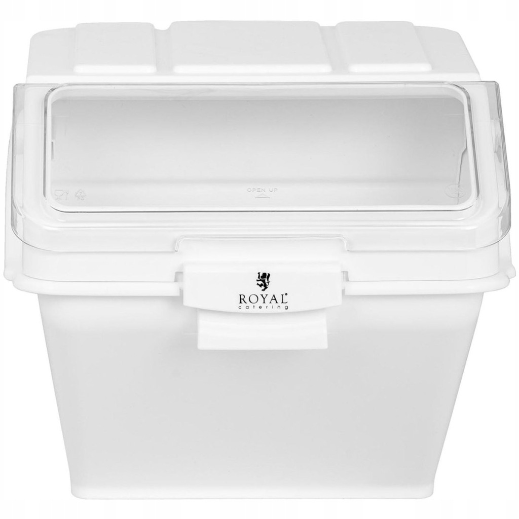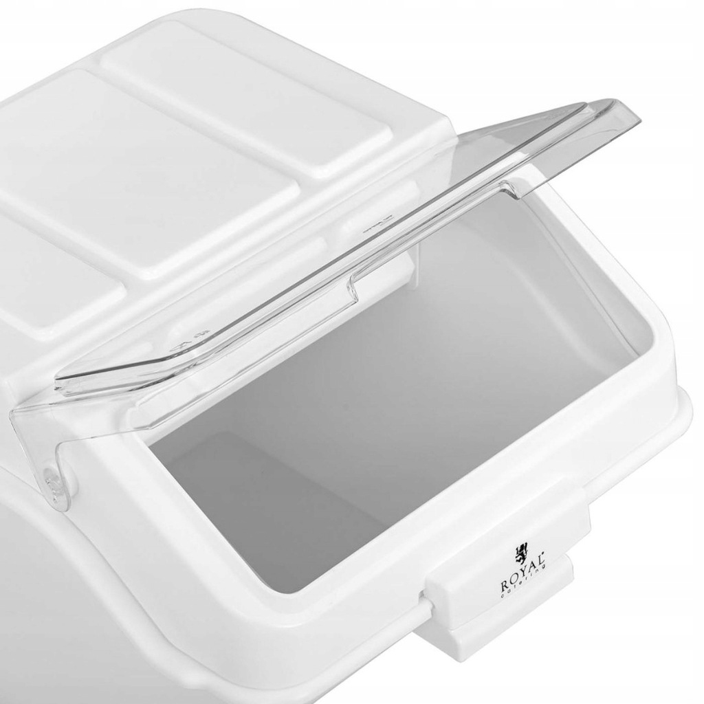 Pojemnik na produkty sypkie Royal Catering to praktyczny sprzęt w restauracji, kawiarni, barze z szybkim jedzeniem, hotelu, piekarni, firmie cateringowej itp. Idealnie nadaje się do przechowywania suchych składników takich jak mąka, kasza, ryż, orzechy oraz cukier. Produkt o pojemności 47 l (60 kg cukru, 20 kg mąki) wyposażono w przezroczystą pokrywę na zawiasach, która zapewnia wygodny dostęp do zawartości. Do produktu dołączono również szufelkę do nabierania.